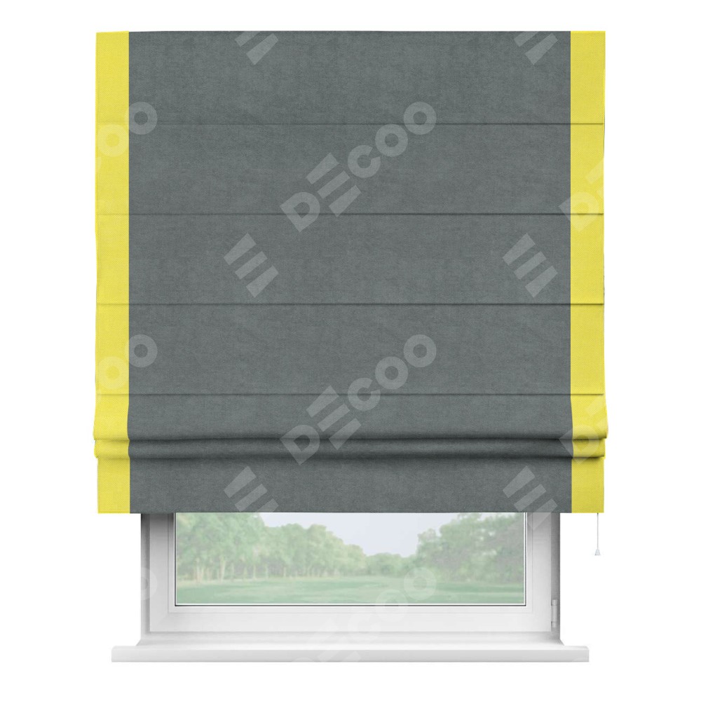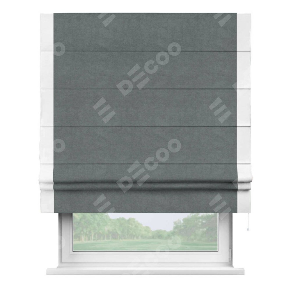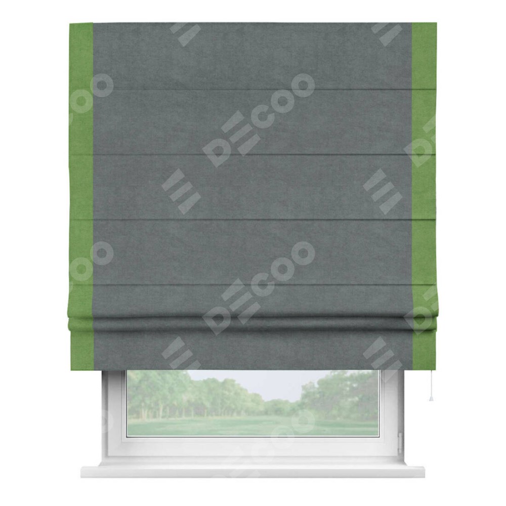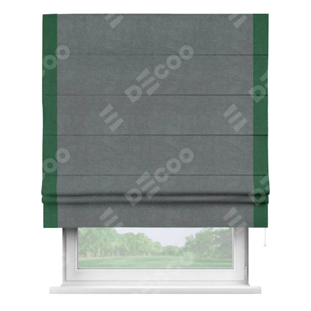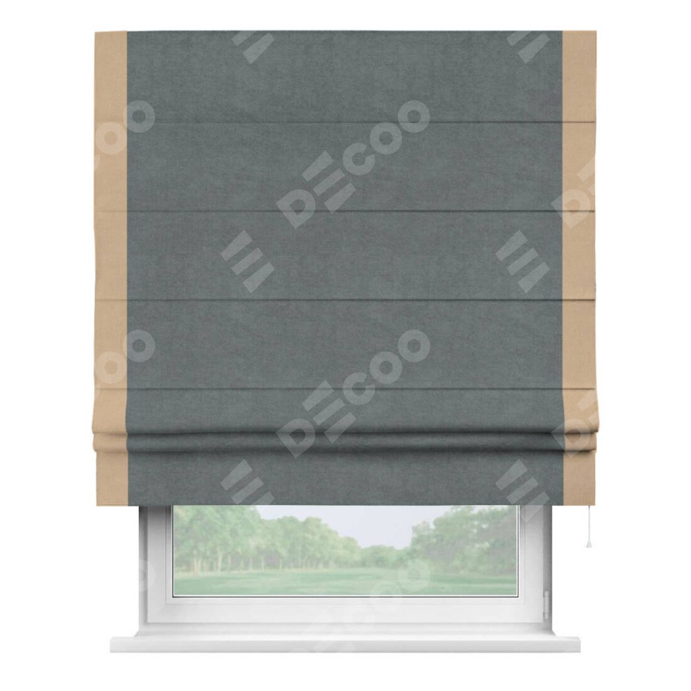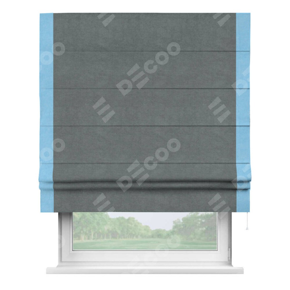 Римская штора производителя «Cortin», используется для проёма, пошита из ткани вельвет серый, артикул ткани 85542. Отделка шторы кантом «Стрим Дуо», ткань для канта используется из вельвета разной расцветки на выбор. Имеет универсальный механизм и подходит для монтажа: на потолок, на стену и в нишу.