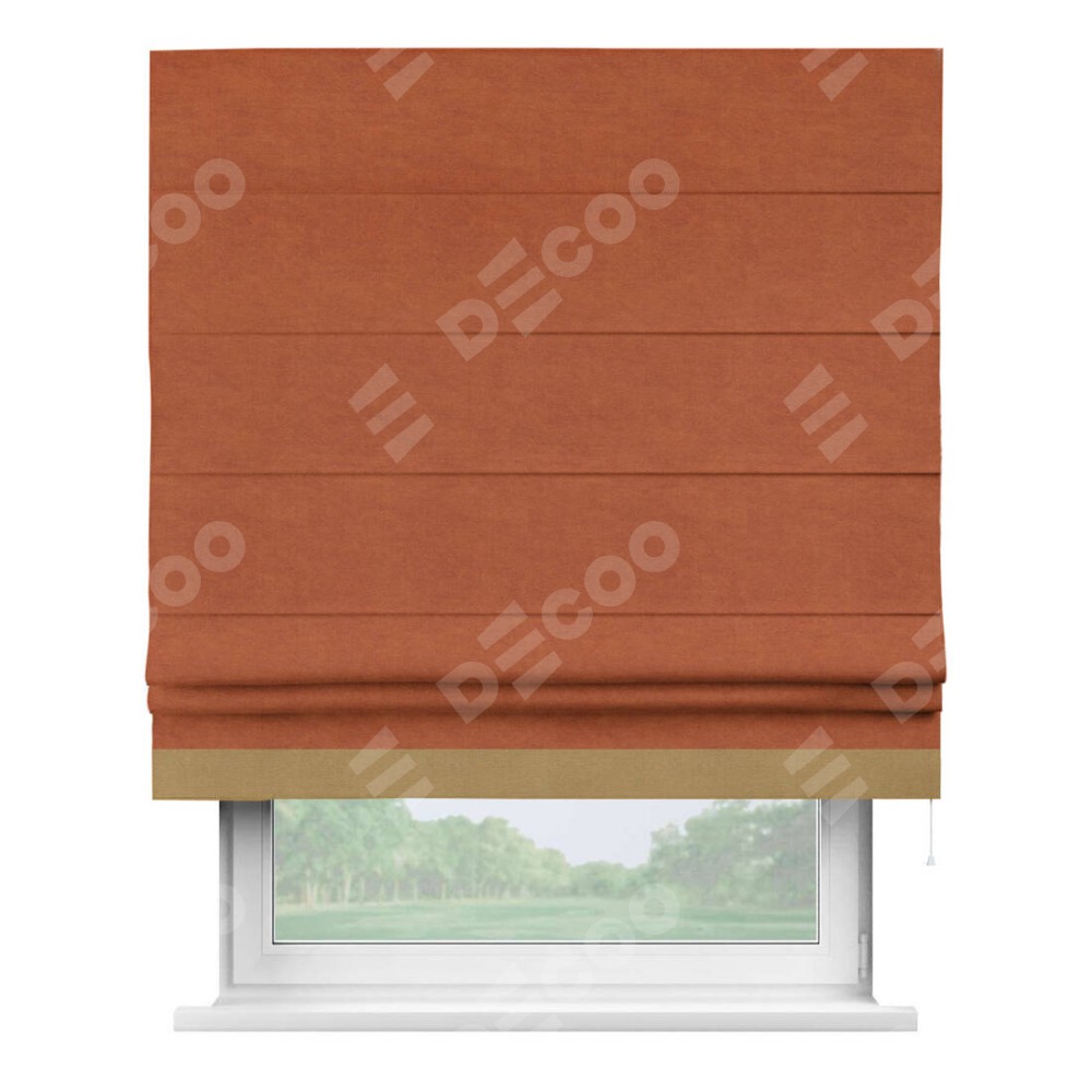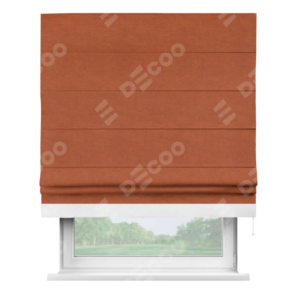 Римская штора производителя «Cortin», используется для проёма, пошита из ткани вельвет терракотовый, артикул ткани 85548. Отделка шторы кантом «Джестер», ткань для канта используется из вельвета разной расцветки на выбор. Имеет универсальный механизм и подходит для монтажа: на потолок, на стену и в нишу.
