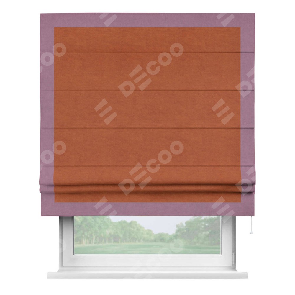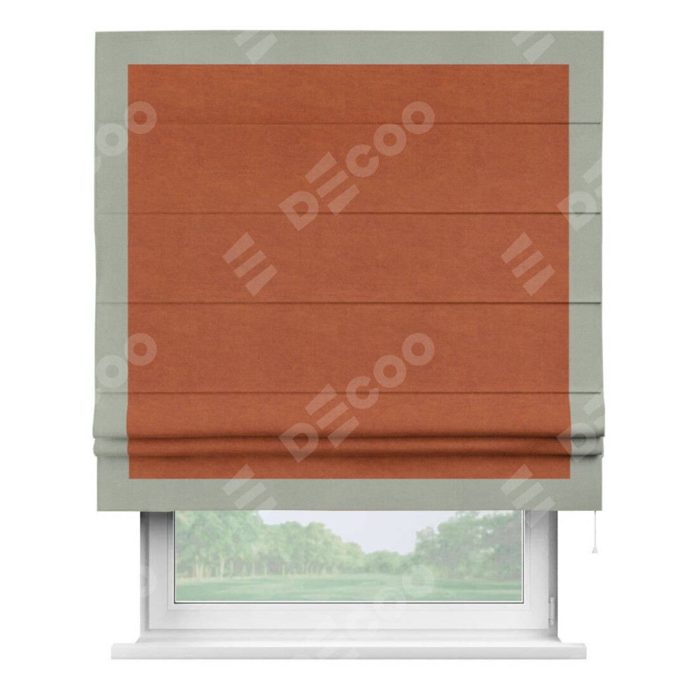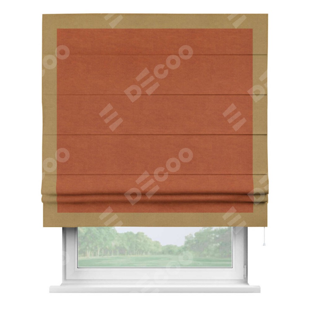 Римская штора производителя «Cortin», используется для проёма, пошита из ткани вельвет терракотовый, артикул ткани 85548. Отделка шторы кантом «Чесс», ткань для канта используется из вельвета разной расцветки на выбор. Имеет универсальный механизм и подходит для монтажа: на потолок, на стену и в нишу.