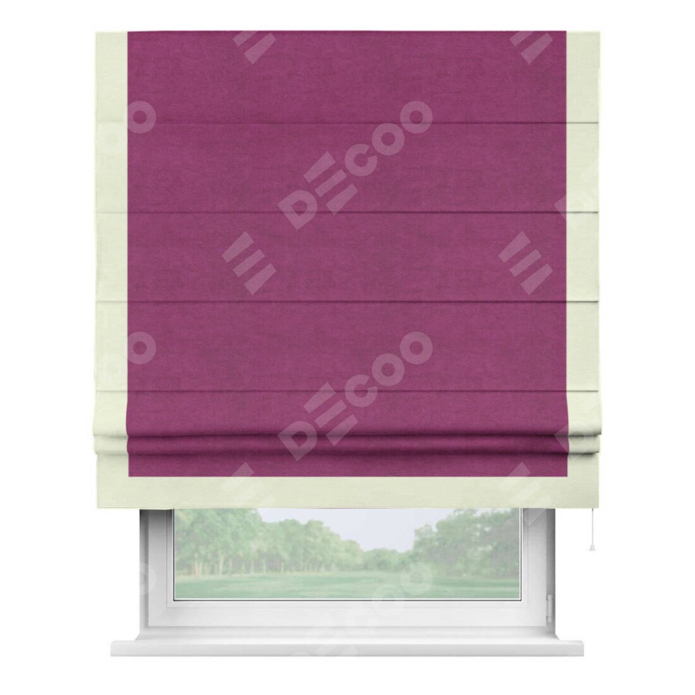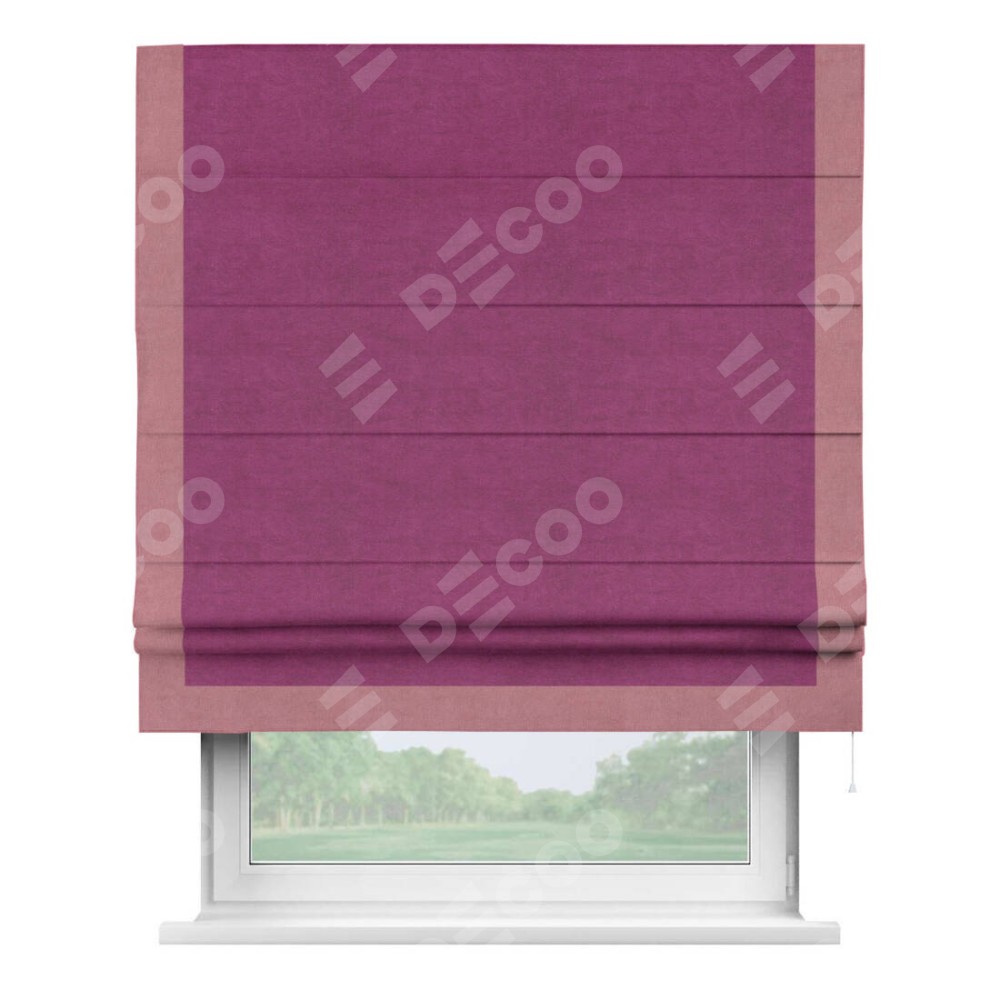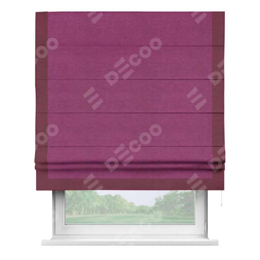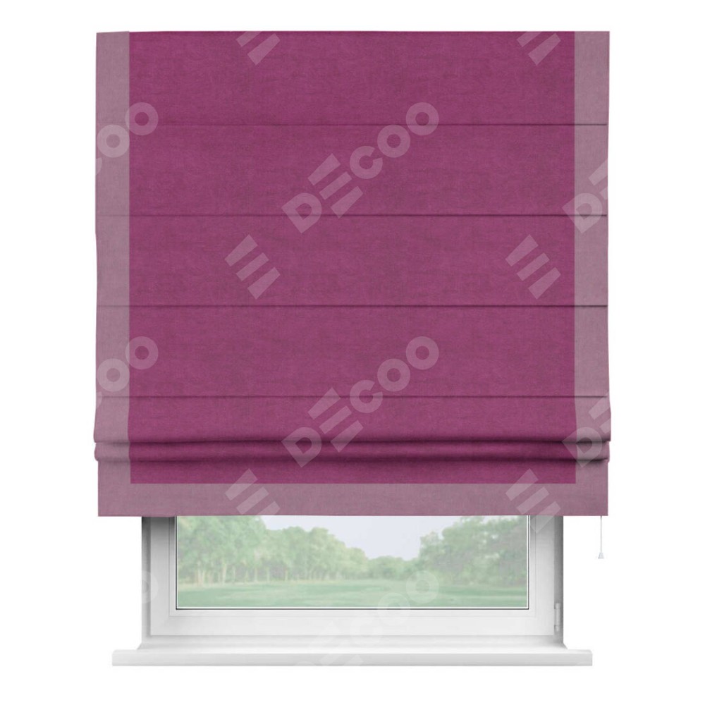 Римская штора производителя «Cortin», используется для проёма, пошита из ткани вельвет фиолетовый, артикул ткани 85552. Отделка шторы кантом «Виктория», ткань для канта используется из вельвета разной расцветки на выбор. Имеет универсальный механизм и подходит для монтажа: на потолок, на стену и в нишу.