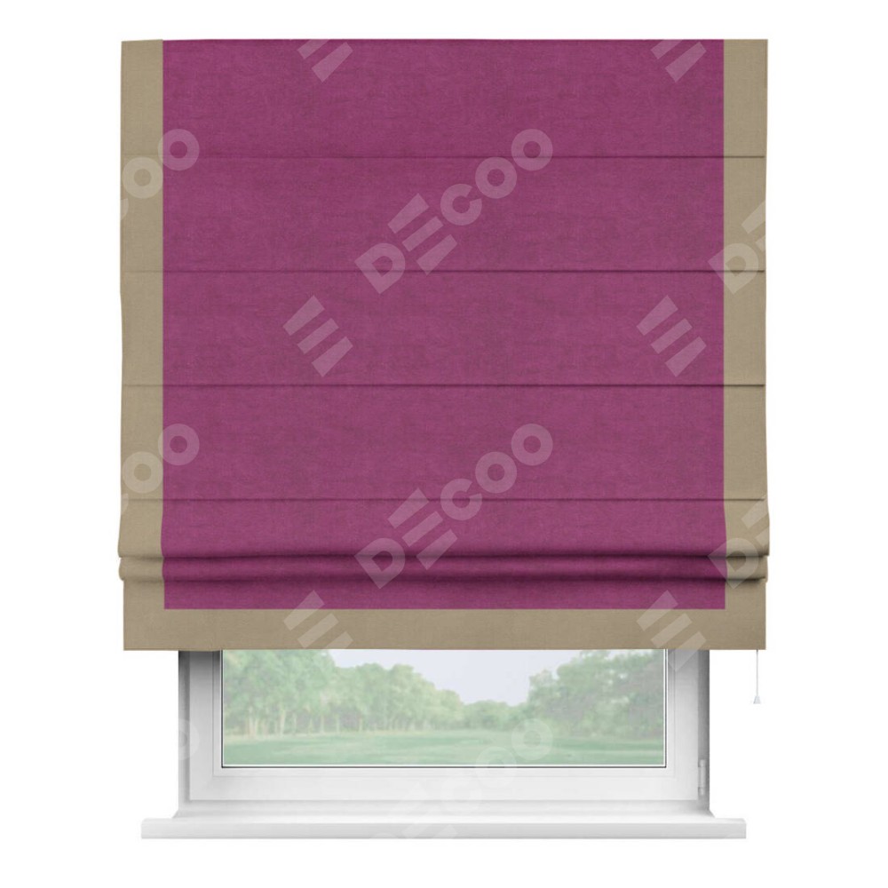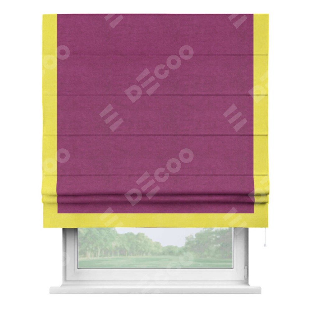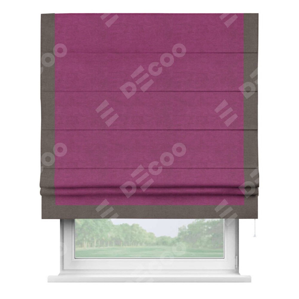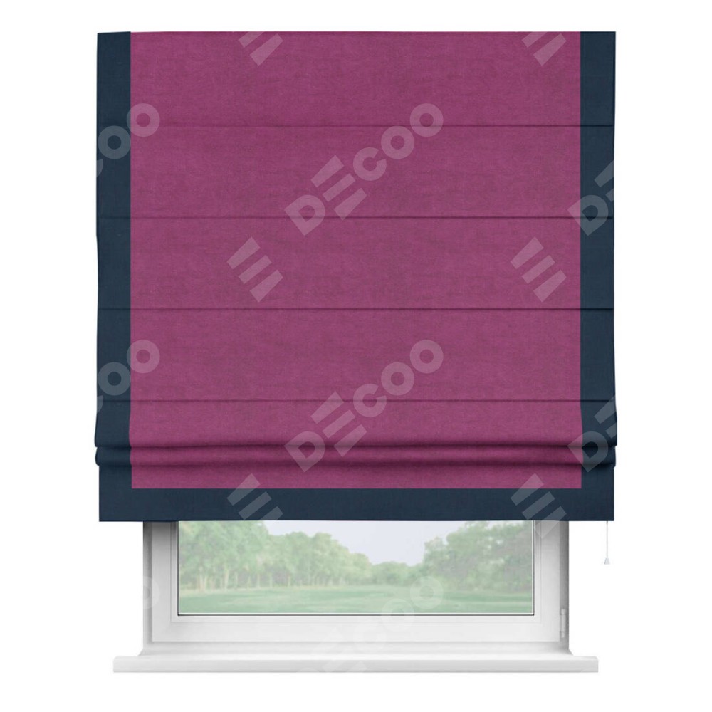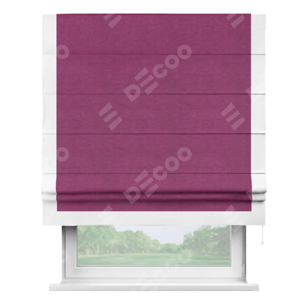 Римская штора производителя «Cortin», используется для проёма, пошита из ткани вельвет фиолетовый, артикул ткани 85552. Отделка шторы кантом «Виктория», ткань для канта используется из вельвета разной расцветки на выбор. Имеет универсальный механизм и подходит для монтажа: на потолок, на стену и в нишу.