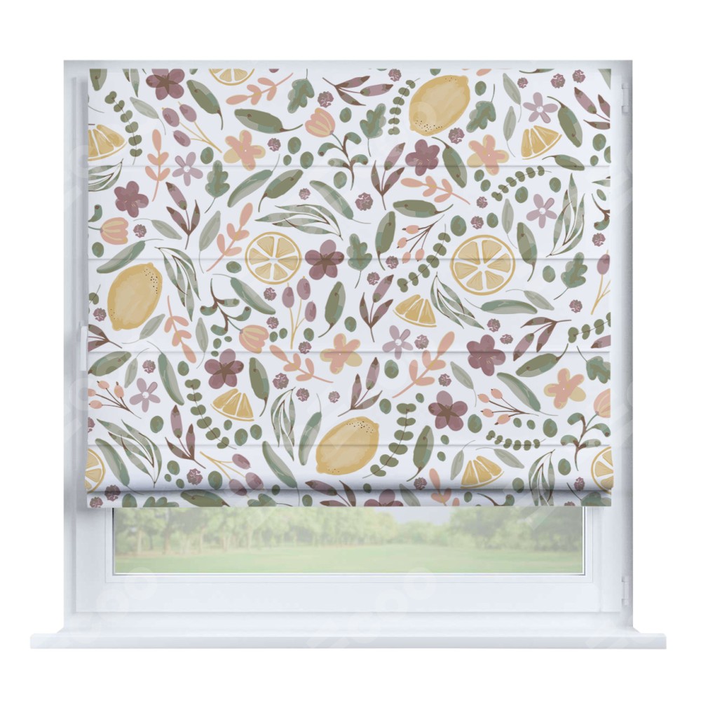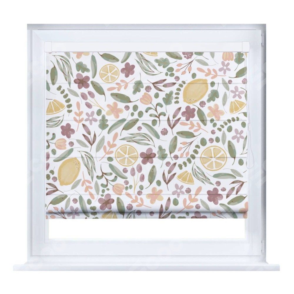 Римская штора производителя «Cortin», устанавливается на створку окна, пошита из ткани блэкаут с нанесением сублимационной печати «Лимоны и цветы». Штора шьётся по индивидуальным размерам, для данного типа римской шторы возможная ширина от 35 до 150 см., высота до 250 см.