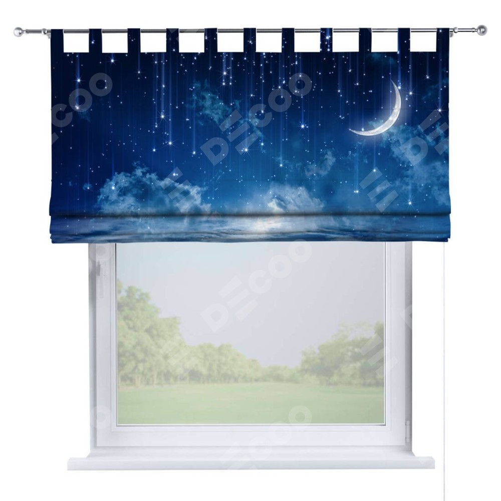 Римская штора производителя «Cortin», используется для проёма, пошита из ткани блэкаут с нанесением сублимационной печати «Ночное небо». Данная модель пошита на петлях, комплектуется на выбор круглым карнизом и подходит для монтажа на стену. Римская штора на петлях имеет простую систему регулировки высоты, отличительным преимуществом данной модели является простой способ монтажа. Достаточно повесить ее на трубу и штора готова!