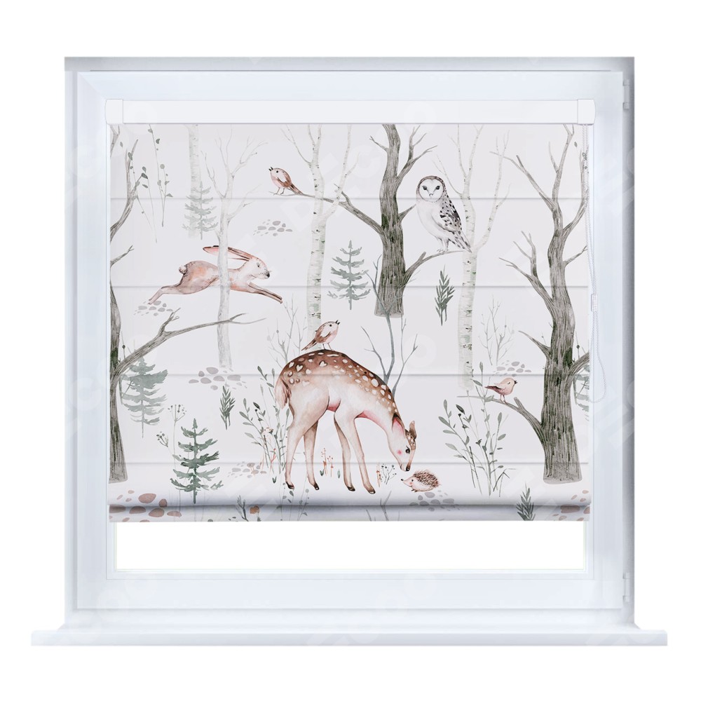 Римская штора кассетного типа, производителя «Cortin», устанавливается только на пластиковые окна и прилегает к стеклопакету, пошита из ткани блэкаут с нанесением сублимационной печати «Скандинавский питомник».