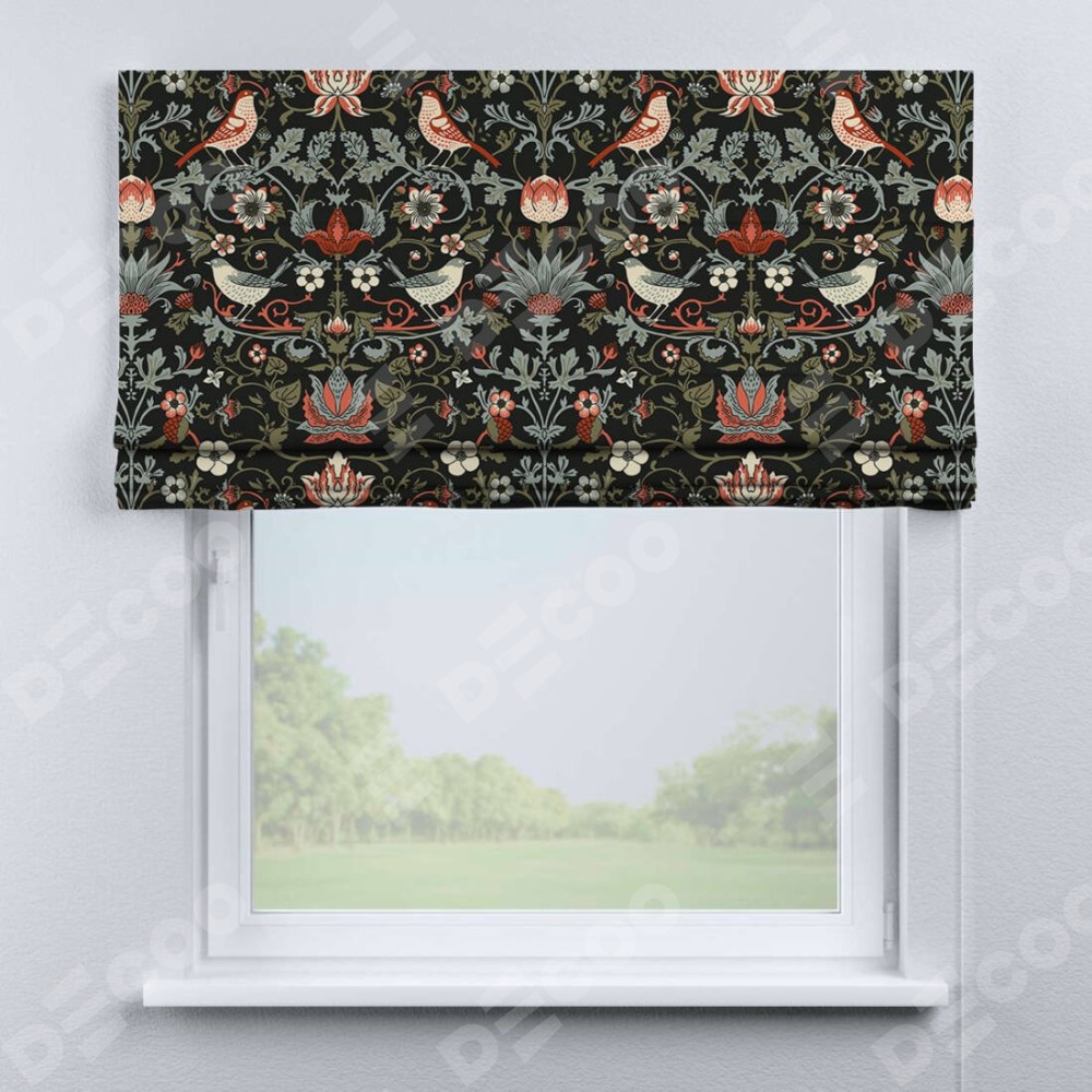 Римская штора производителя «Cortin», используется для проёма, пошита из ткани блэкаут с нанесением сублимационной печати «Зачарованные птицы». Имеет универсальный механизм и подходит для монтажа: на потолок, на стену и в нишу.