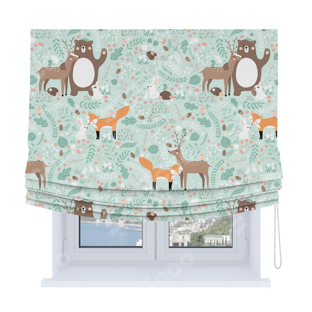 Римская штора Soft производителя «Cortin», используется для проёма, пошита из ткани блэкаут с нанесением сублимационной печати «Лесные друзья». Имеет универсальный механизм и подходит для монтажа: на потолок, на стену и в нишу. В отличие от стандартных римских штор, римская штора Soft не имеет горизонтальных вставок и нижнего отвеса. Это позволяет ткани произвольно драпироваться в свободные мягкие складки.