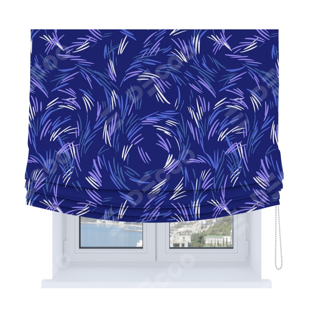 Римская штора Soft производителя «Cortin», используется для проёма, пошита из ткани блэкаут с нанесением сублимационной печати «Синяя абстракция». Имеет универсальный механизм и подходит для монтажа: на потолок, на стену и в нишу. В отличие от стандартных римских штор, римская штора Soft не имеет горизонтальных вставок и нижнего отвеса. Это позволяет ткани произвольно драпироваться в свободные мягкие складки.