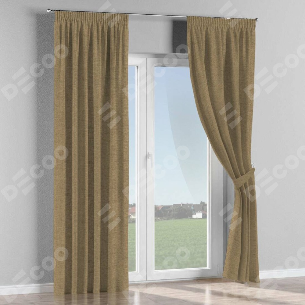 Комплект прямых штор, от производителя «Cortin», пошиты из ткани стиф димаут тёмно-бежевый, артикул ткани 18085. С изнаночной стороны в верхней части штор пристрачивается шторная лента с декоративными складками «Карандаш». Для создания элегантных складок прямые шторы шьются по стандарту с коэффициентом 1:2 (на 100 см. ширины проёма 200 см. ширины ткани).
