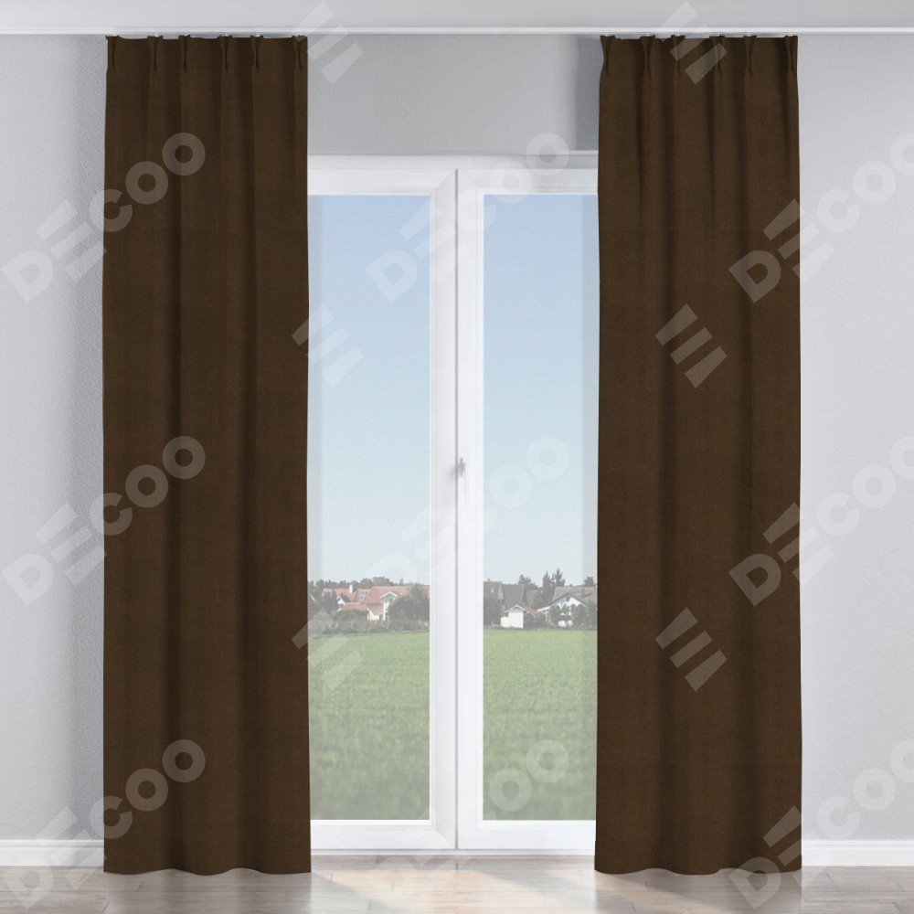 Комплект прямых штор, от производителя «Cortin», пошиты из ткани вельвет тёмно-коричневый, артикул ткани 30991. С изнаночной стороны в верхней части штор пристрачивается шторная лента с декоративными складками «Кустик». Для создания элегантных складок прямые шторы шьются по стандарту с коэффициентом 1:2 (на 100 см. ширины проёма 200 см. ширины ткани).