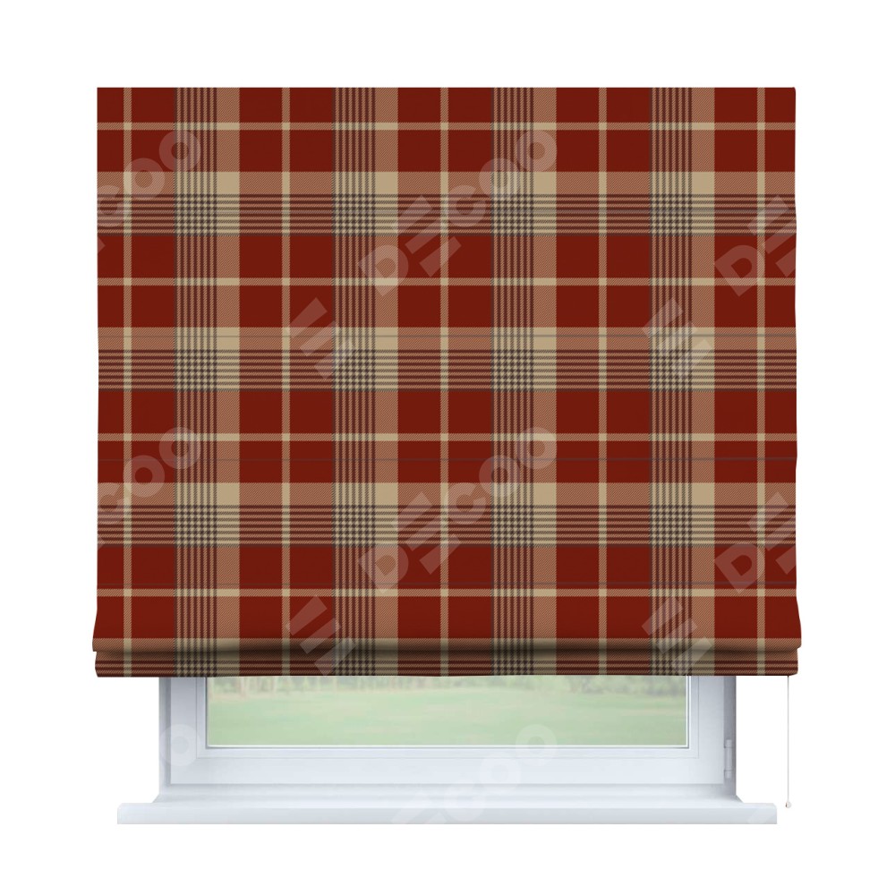 Римская штора производителя «Cortin», используется для проёма, пошита из ткани блэкаут с нанесением сублимационной печати «Бежево-бордовая клетка». Имеет универсальный механизм и подходит для монтажа: на потолок, на стену и в нишу.