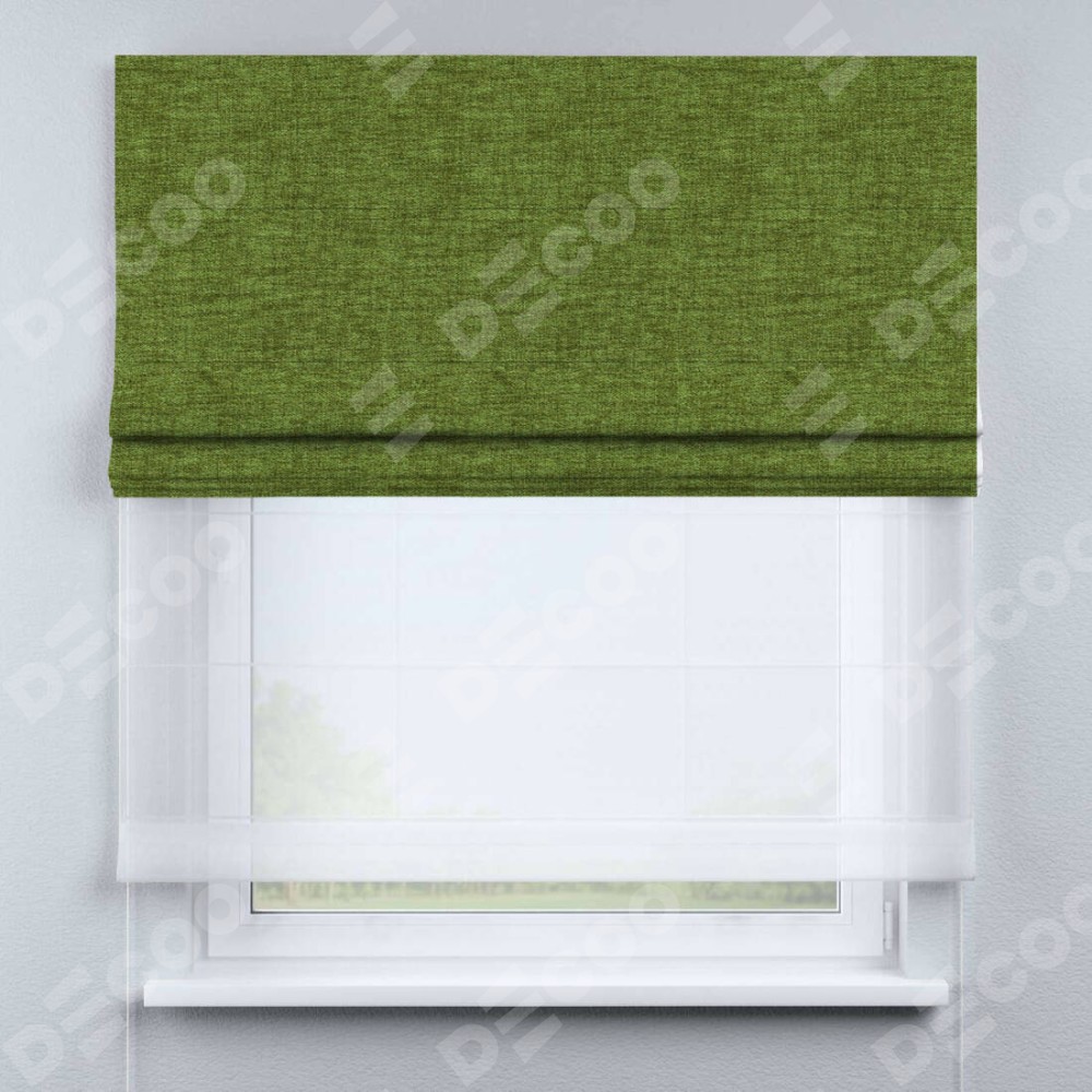 Римская штора день-ночь производителя «Cortin», используется для проёма, пошита из двух полотен, с лицевой стороны рогожка димаут салатовый артикул 80423, вторая ткань тюль (по стандарту комплектуется тюль белого цвета артикул V-01). Имеет универсальный механизм и подходит для монтажа: на потолок, на стену и в нишу.