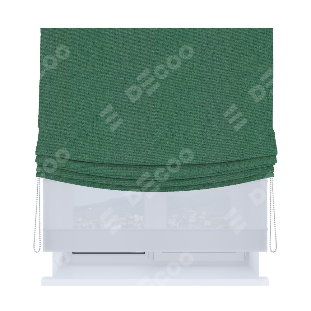 Римская штора день-ночь производителя «Cortin», используется для проёма, пошита из двух полотен, с лицевой стороны твид блэкаут зелёный артикул 21589, вторая ткань тюль (по стандарту комплектуется тюль белого цвета артикул V-01). Имеет универсальный механизм и подходит для монтажа: на потолок, на стену и в нишу. Удобное управление каждой шторой отдельно.