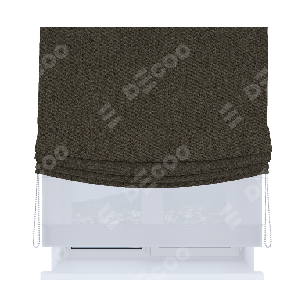 Римская штора день-ночь производителя «Cortin», используется для проёма, пошита из двух полотен, с лицевой стороны твид блэкаут тёмно-коричневый артикул 21584, вторая ткань тюль (по стандарту комплектуется тюль белого цвета артикул V-01). Имеет универсальный механизм и подходит для монтажа: на потолок, на стену и в нишу. Удобное управление каждой шторой отдельно.