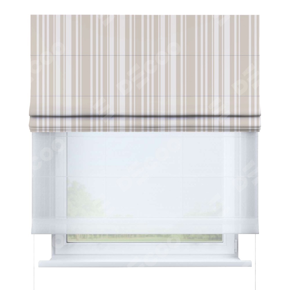 Римская штора день-ночь производителя «Cortin», используется для проёма, пошита из двух полотен, с лицевой блэкаут с нанесением сублимационной печати «Бежевые вертикальные полоски», вторая ткань тюль (по стандарту комплектуется тюль белого цвета артикул V-01). Имеет универсальный механизм и подходит для монтажа: на потолок, на стену и в нишу.