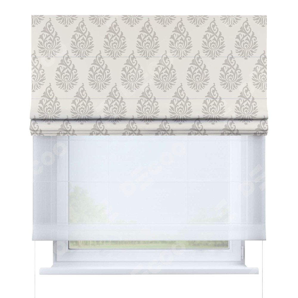 Римская штора день-ночь производителя «Cortin», используется для проёма, пошита из двух полотен, с лицевой блэкаут с нанесением сублимационной печати «Изящный кулон», вторая ткань тюль (по стандарту комплектуется тюль белого цвета артикул V-01). Имеет универсальный механизм и подходит для монтажа: на потолок, на стену и в нишу.