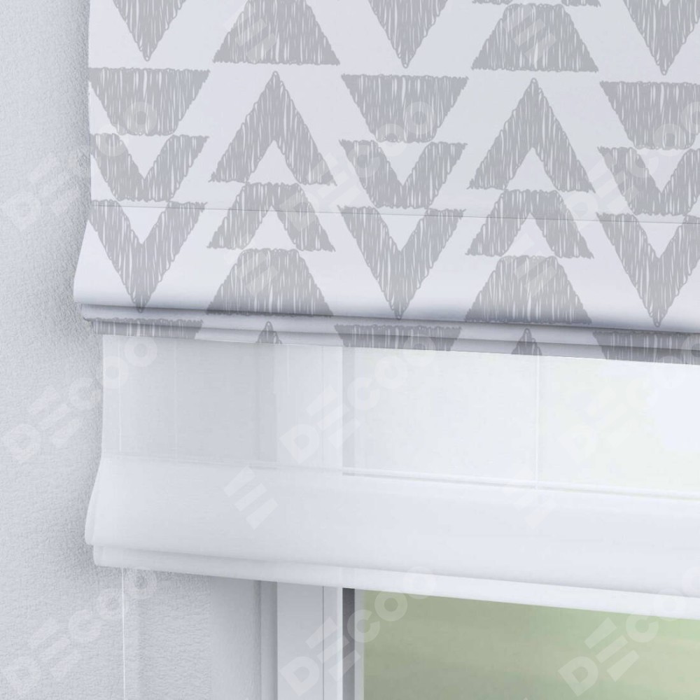 Римская штора день-ночь производителя «Cortin», используется для проёма, пошита из двух полотен, с лицевой блэкаут с нанесением сублимационной печати «Серые стрелки», вторая ткань тюль (по стандарту комплектуется тюль белого цвета артикул V-01). Имеет универсальный механизм и подходит для монтажа: на потолок, на стену и в нишу.