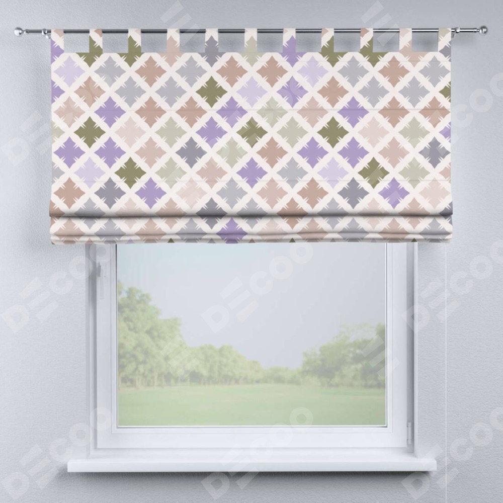 Римская штора производителя «Cortin», используется для проёма, пошита из ткани блэкаут с нанесением сублимационной печати «Фигурные плитки». Данная модель пошита на петлях, комплектуется на выбор круглым карнизом и подходит для монтажа на стену. Римская штора на петлях имеет простую систему регулировки высоты, отличительным преимуществом данной модели является простой способ монтажа. Достаточно повесить ее на трубу и штора готова!