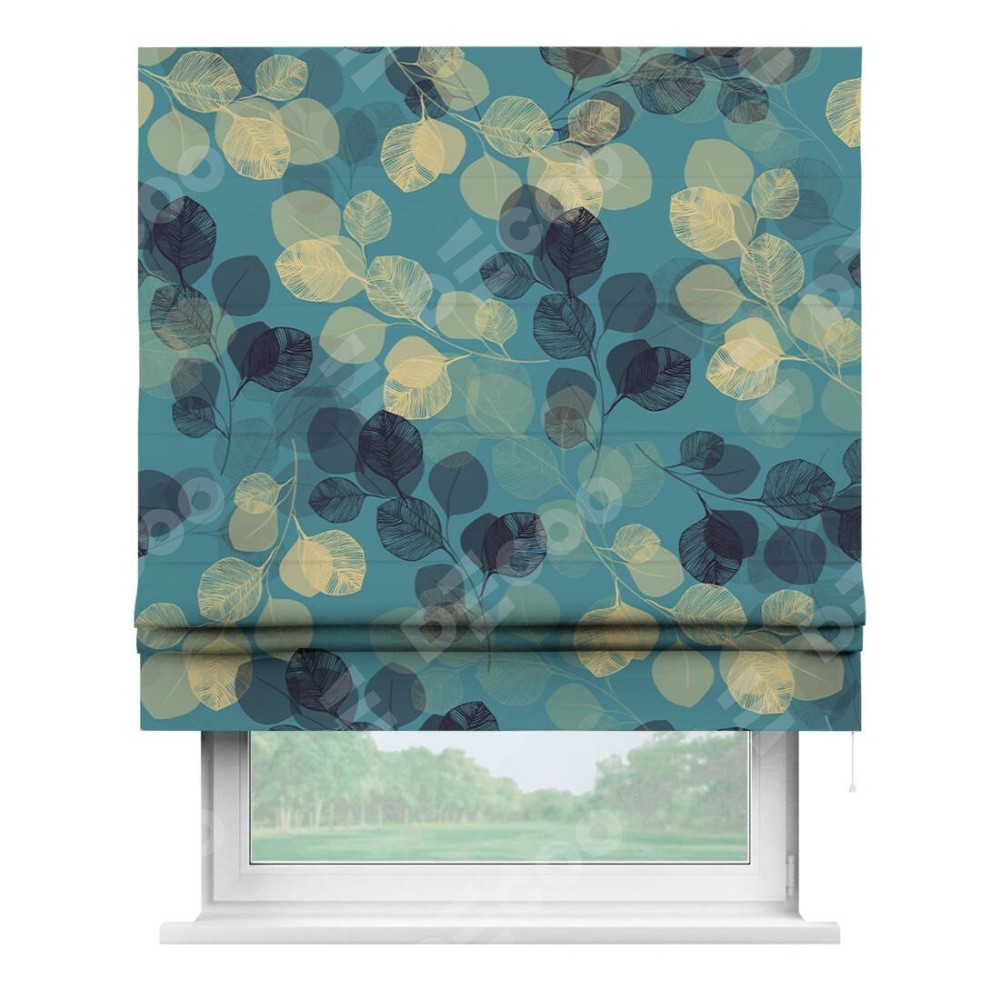 Римская штора производителя «Cortin», используется для проёма, пошита из ткани блэкаут с нанесением сублимационной печати «Листья в небе». Имеет универсальный механизм и подходит для монтажа: на потолок, на стену и в нишу.