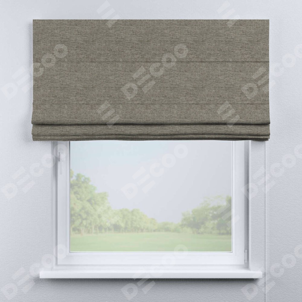 Римская штора производителя «Cortin», используется для проёма, пошита из ткани стиф димаут серо-коричневый, артикул ткани 44028. Имеет универсальный механизм и подходит для монтажа: на потолок, на стену и в нишу.