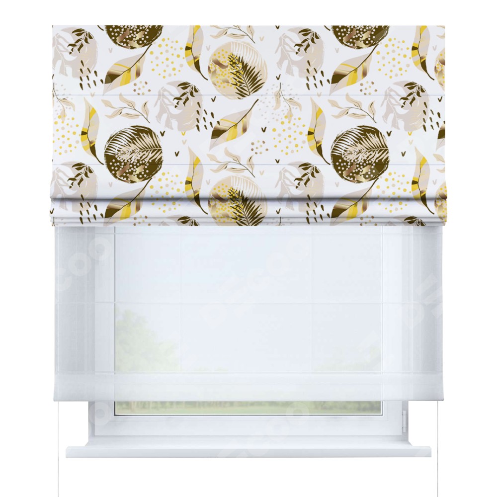Римская штора день-ночь производителя «Cortin», используется для проёма, пошита из двух полотен, с лицевой блэкаут с нанесением сублимационной печати «Золотые листья», вторая ткань тюль (по стандарту комплектуется тюль белого цвета артикул V-01). Имеет универсальный механизм и подходит для монтажа: на потолок, на стену и в нишу.