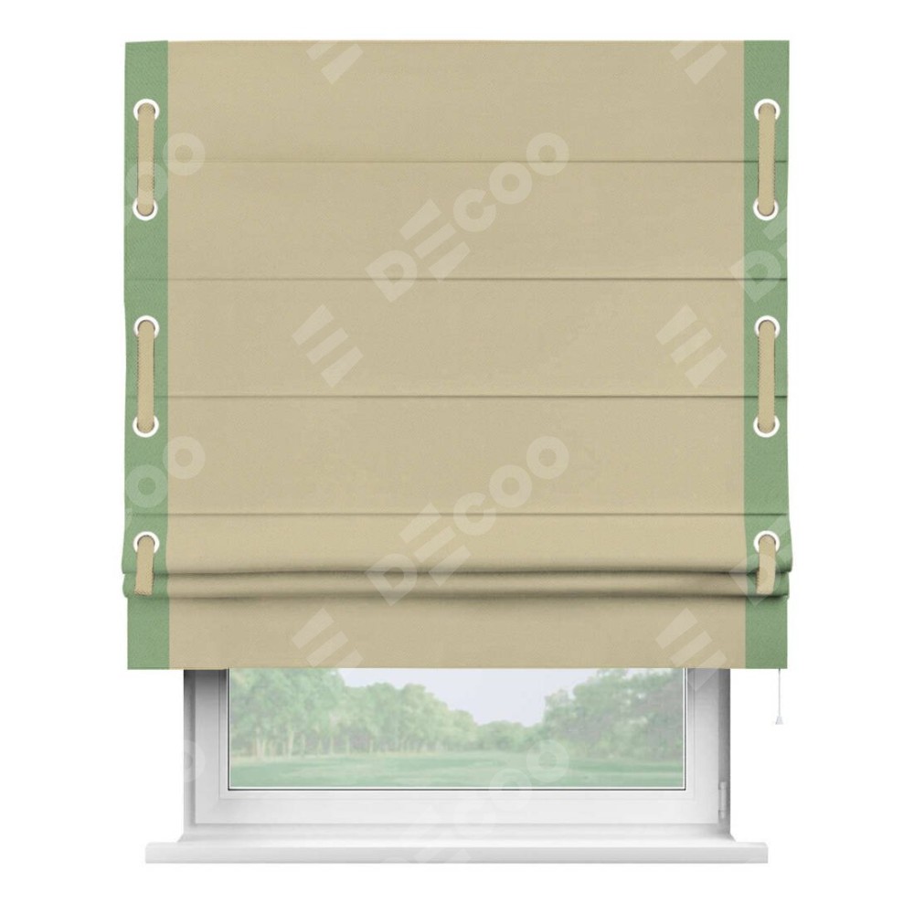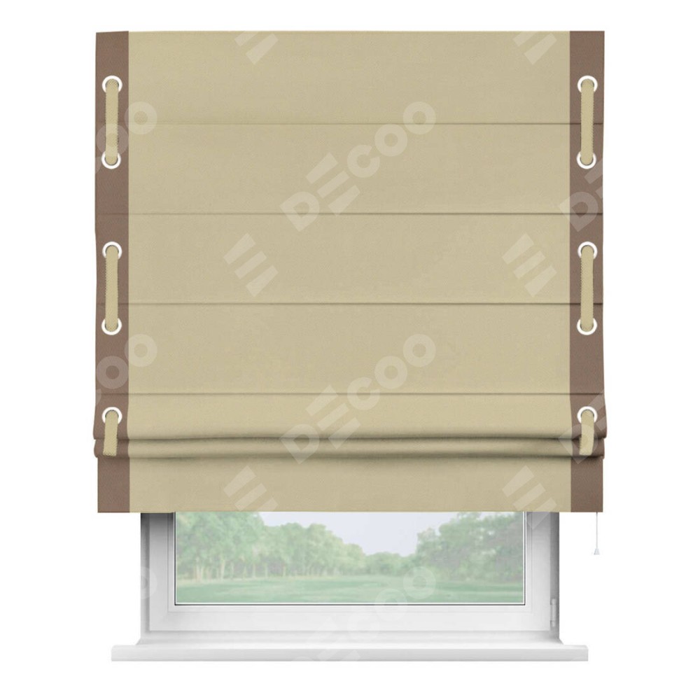 Римская штора производителя «Cortin», используется для проёма, пошита из ткани блэкаут однотонный кофейный, артикул ткани 13130. Отделка шторы кантом «Стрим Дуо» на кантах расположены люверсы с пояском, ткань для канта используется из блэкаута однотонного разной расцветки на выбор. Ткань для пояска обычно используется из основной ткани шторы, а так же можно сделать из любой расцветки по желанию. Имеет универсальный механизм и подходит для монтажа: на потолок, на стену и в нишу.