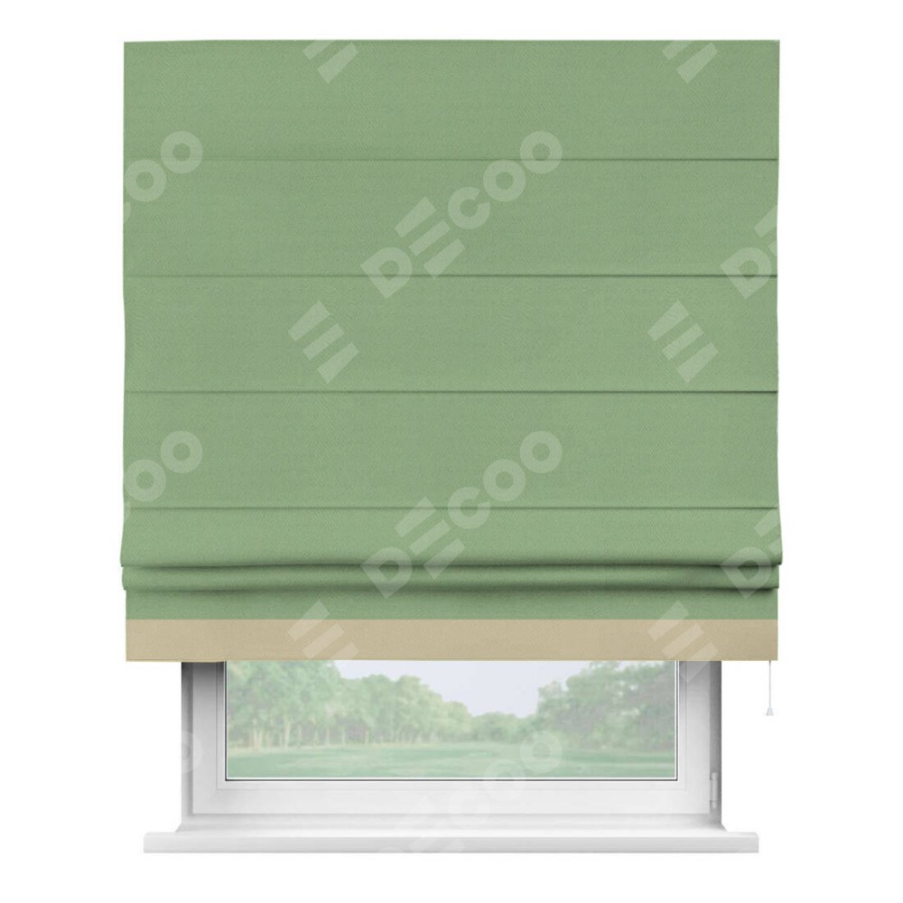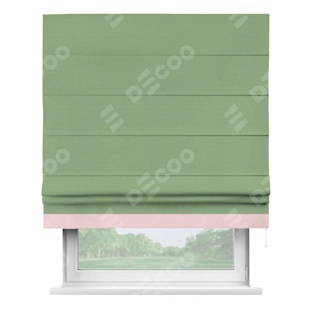Римская штора производителя «Cortin», используется для проёма, пошита из ткани блэкаут однотонный оливковый, артикул ткани 88300. Отделка шторы кантом «Джестер», ткань для канта используется из блэкаута однотонного разной расцветки на выбор. Имеет универсальный механизм и подходит для монтажа: на потолок, на стену и в нишу.