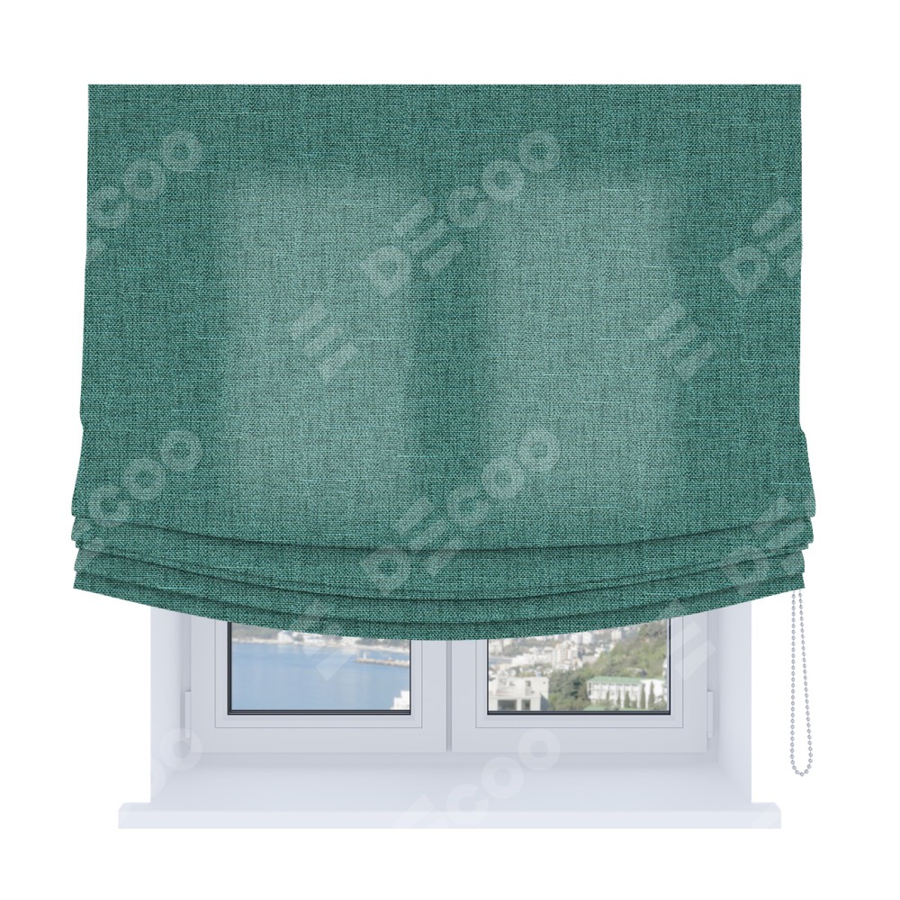 Римская штора Soft производителя «Cortin», используется для проёма, пошита из ткани лён кашемир бирюзовый, артикул ткани 17214. Имеет универсальный механизм и подходит для монтажа: на потолок, на стену и в нишу. В отличие от стандартных римских штор, римская штора Soft не имеет горизонтальных вставок и нижнего отвеса. Это позволяет ткани произвольно драпироваться в свободные мягкие складки.