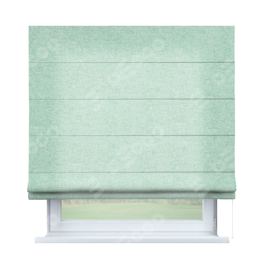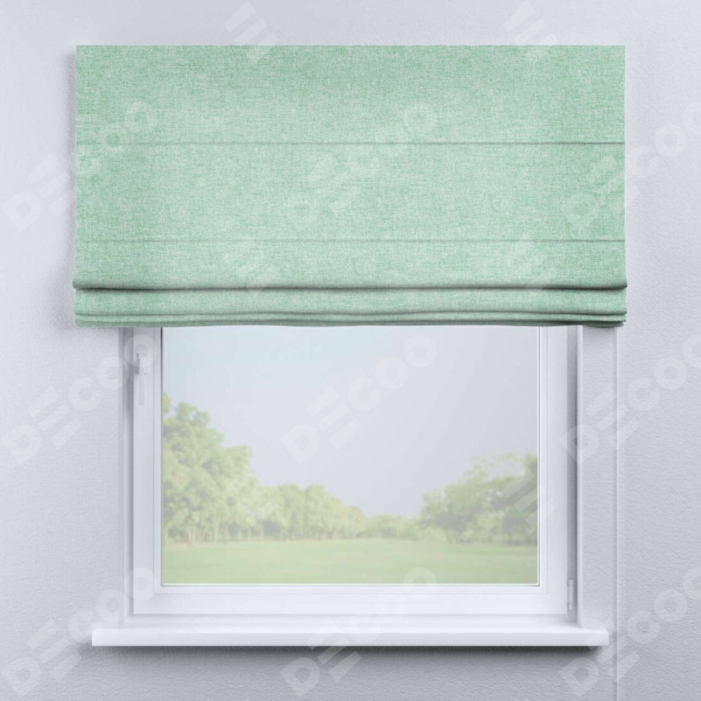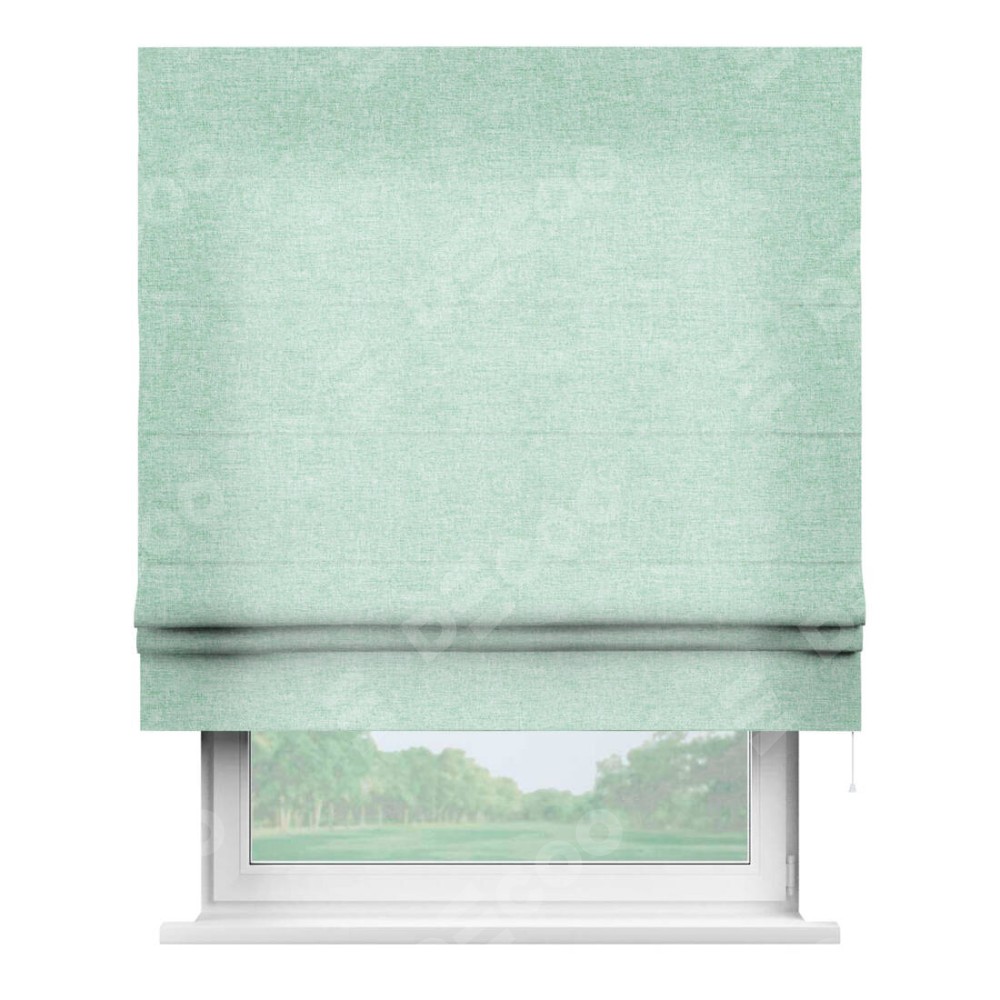 Римская штора производителя «Cortin», используется для проёма, пошита из ткани лён кашемир мятный, артикул ткани 21617. Имеет универсальный механизм и подходит для монтажа: на потолок, на стену и в нишу.