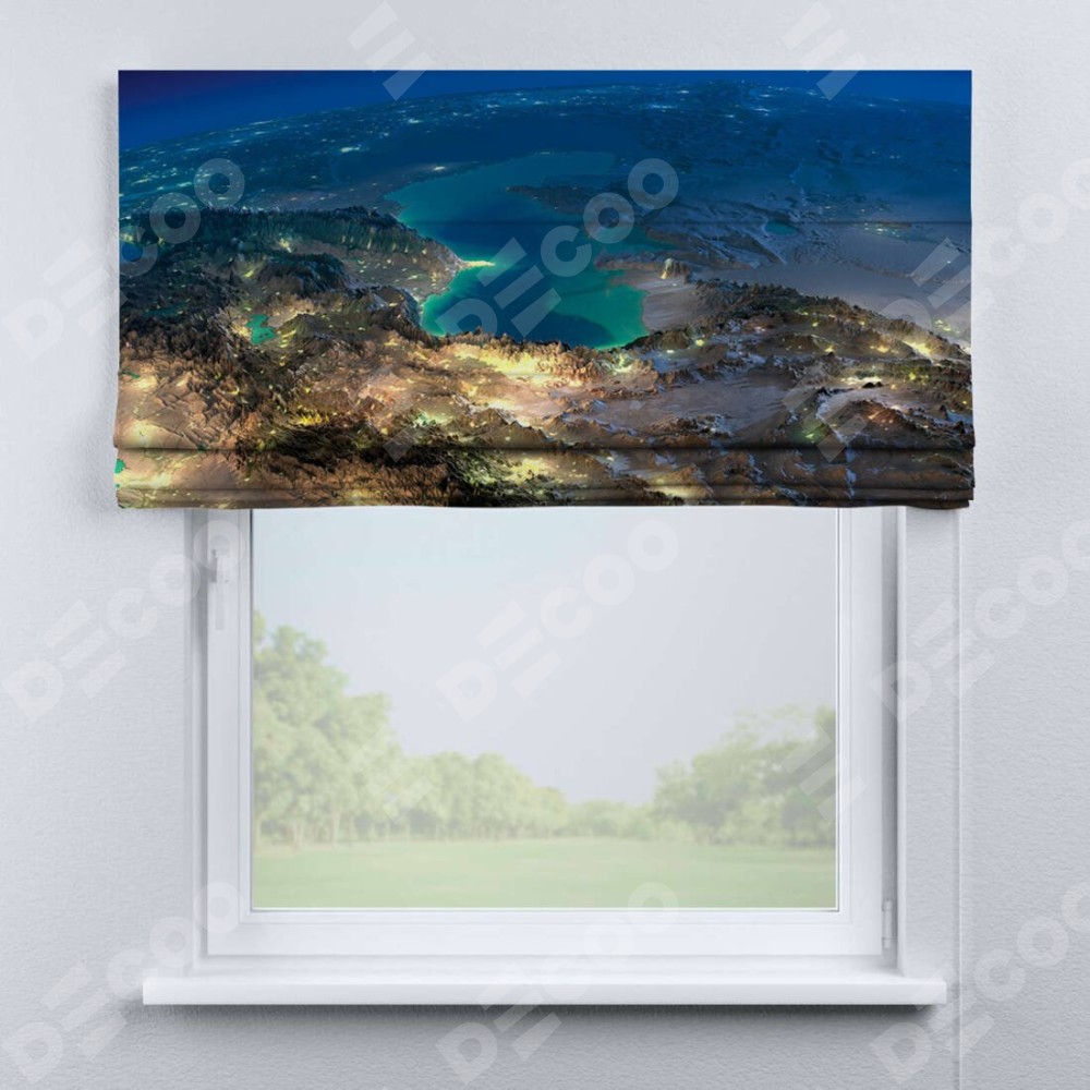 Римская штора производителя «Cortin», используется для проёма, пошита из ткани блэкаут с нанесением сублимационной печати «Ночные огни». Имеет универсальный механизм и подходит для монтажа: на потолок, на стену и в нишу.