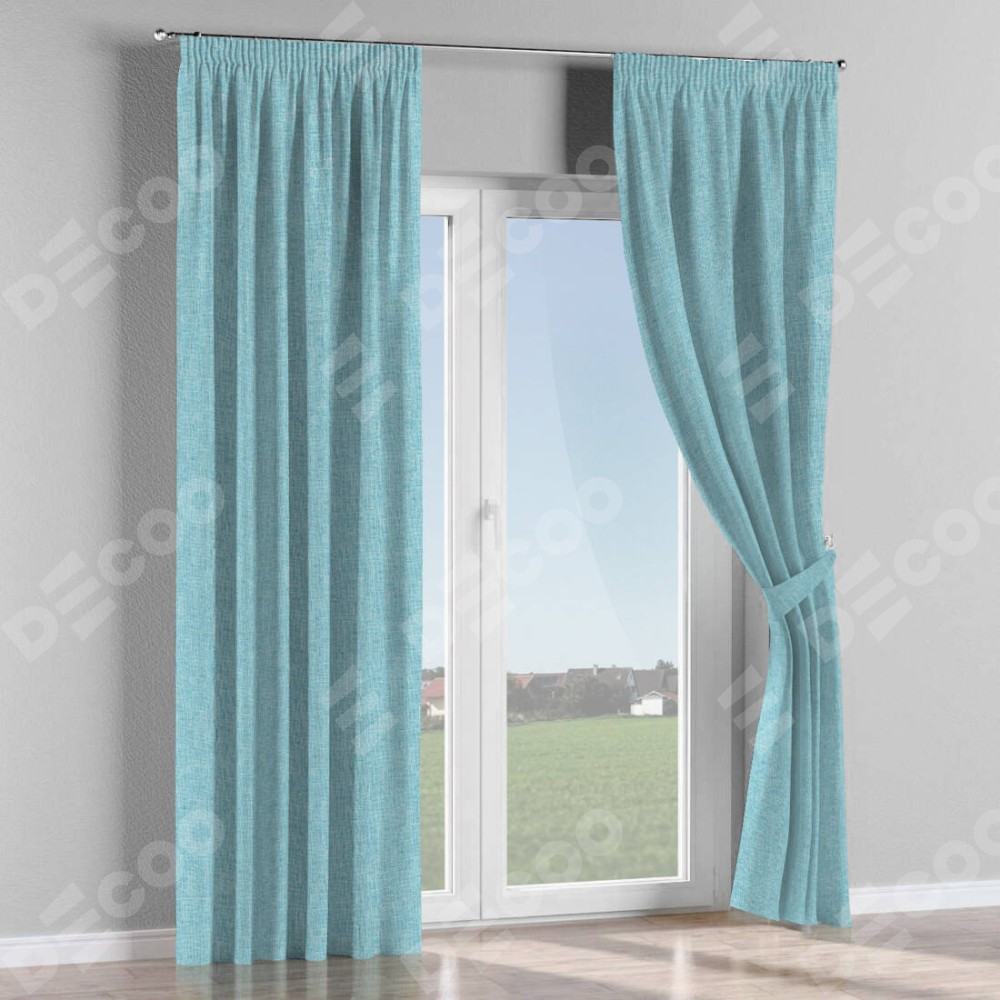 Комплект прямых штор, от производителя «Cortin», пошиты из ткани лён кашемир голубой, артикул ткани 21616. С изнаночной стороны в верхней части штор пристрачивается шторная лента с декоративными складками «Карандаш». Для создания элегантных складок прямые шторы шьются по стандарту с коэффициентом 1:2 (на 100 см. ширины проёма 200 см. ширины ткани).