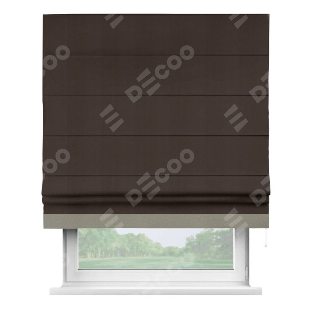 Римская штора производителя «Cortin», используется для проёма, пошита из ткани блэкаут однотонный тёмно-коричневый, артикул ткани 88287. Отделка шторы кантом «Джестер», ткань для канта используется из блэкаута однотонного разной расцветки на выбор. Имеет универсальный механизм и подходит для монтажа: на потолок, на стену и в нишу.