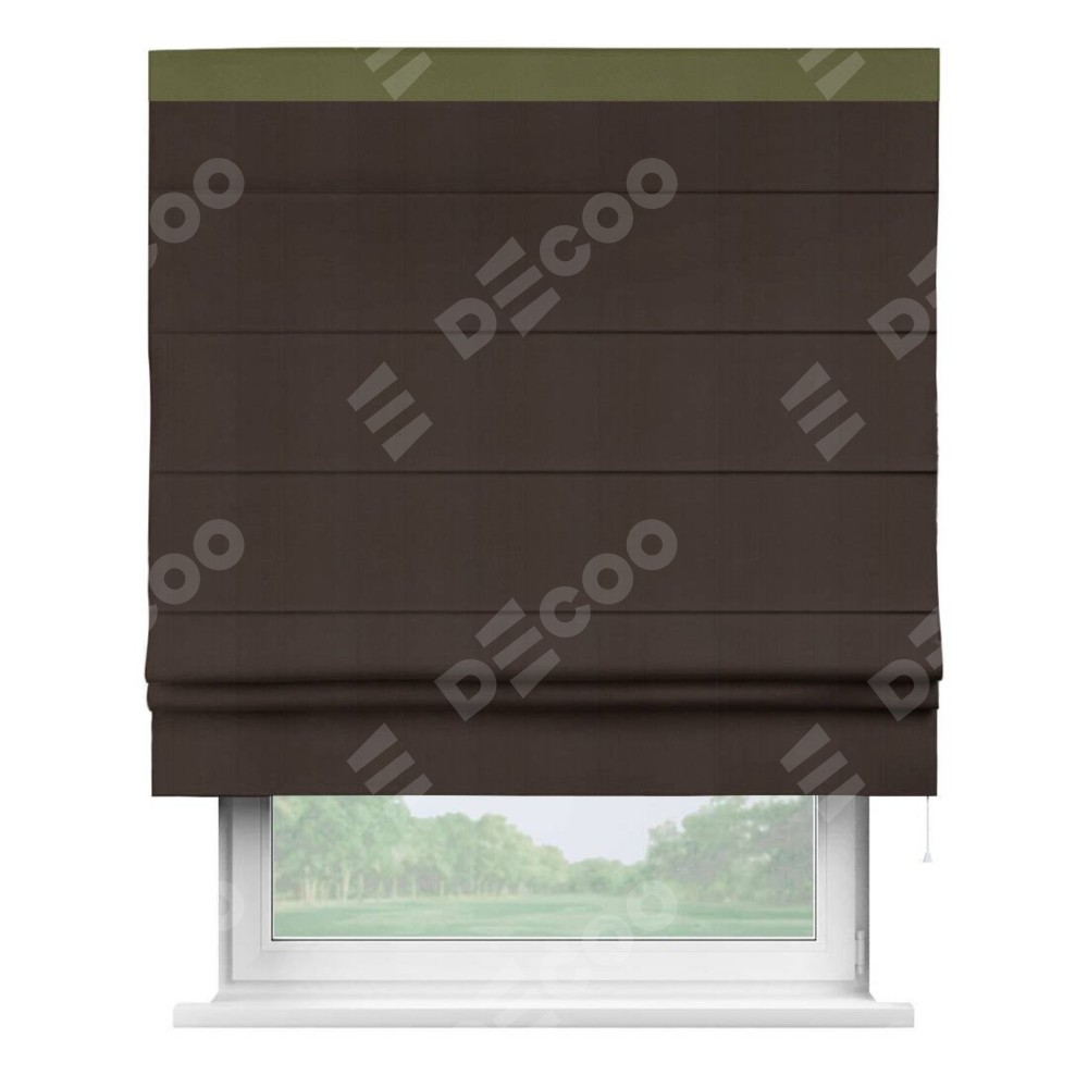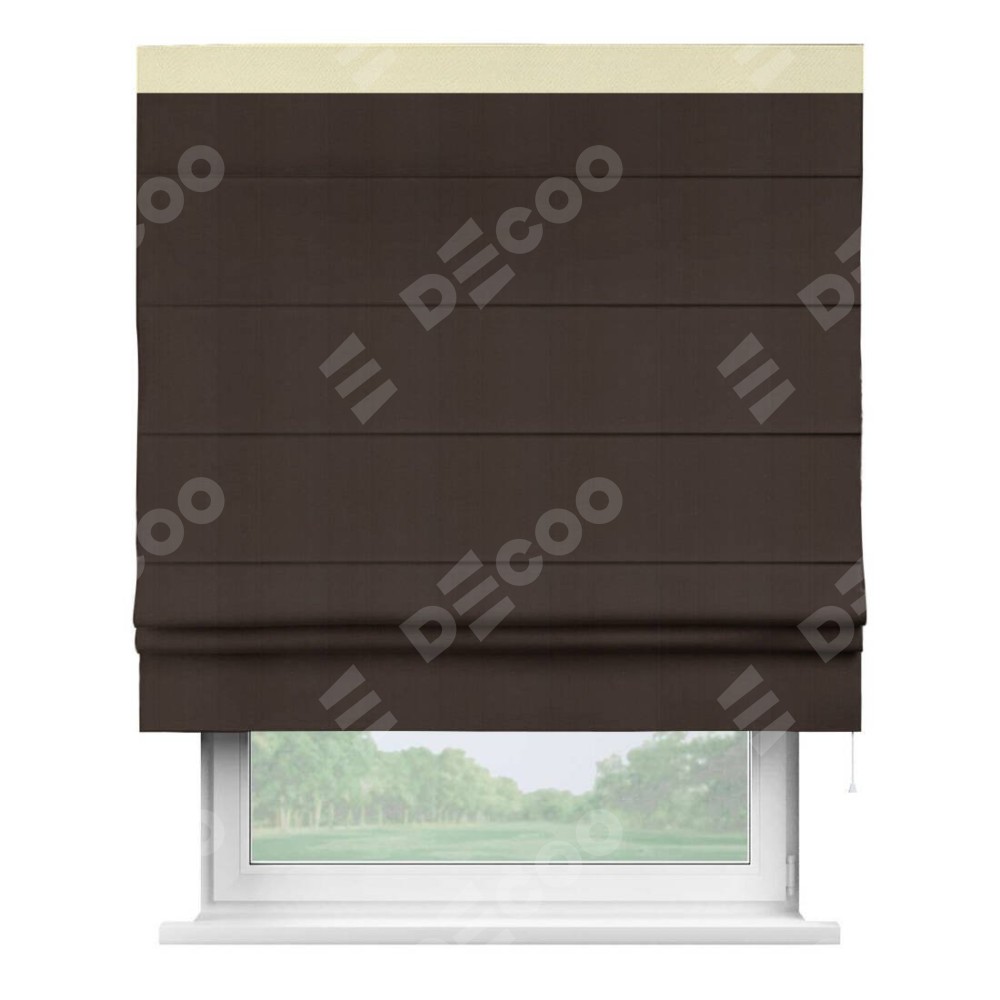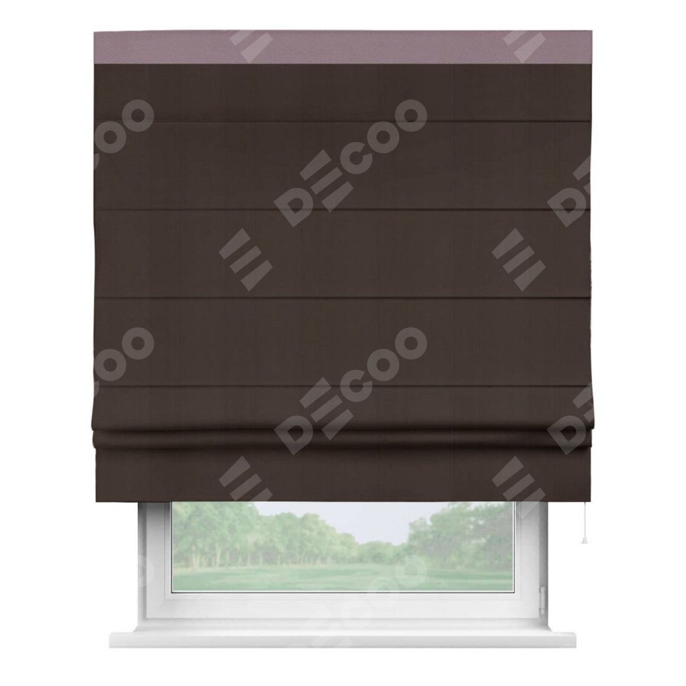 Римская штора производителя «Cortin», используется для проёма, пошита из ткани блэкаут однотонный тёмно-коричневый, артикул ткани 88287. Отделка шторы кантом «Кинг», ткань для канта используется из блэкаута однотонного разной расцветки на выбор. Имеет универсальный механизм и подходит для монтажа: на потолок, на стену и в нишу.