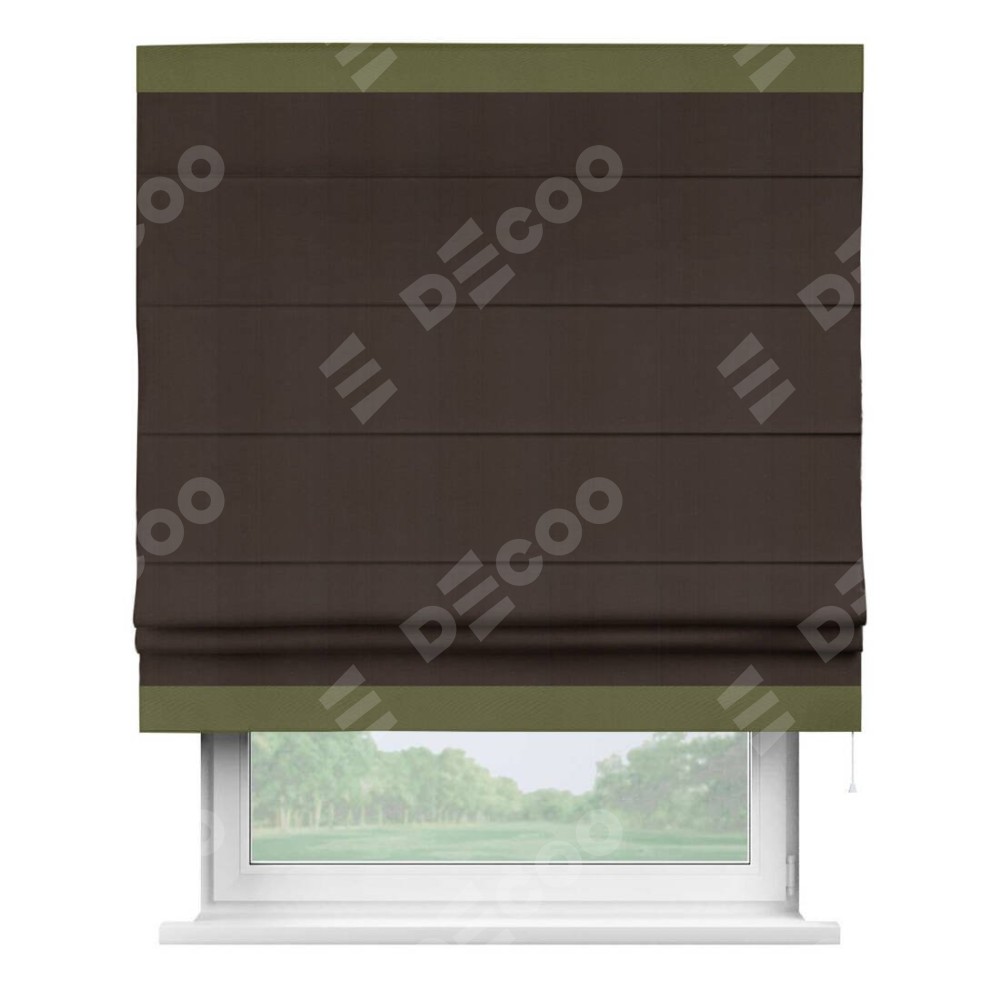 Римская штора производителя «Cortin», используется для проёма, пошита из ткани блэкаут однотонный тёмно-коричневый, артикул ткани 88287. Отделка шторы кантом «Горизонт», ткань для канта используется из блэкаута однотонного разной расцветки на выбор. Имеет универсальный механизм и подходит для монтажа: на потолок, на стену и в нишу.