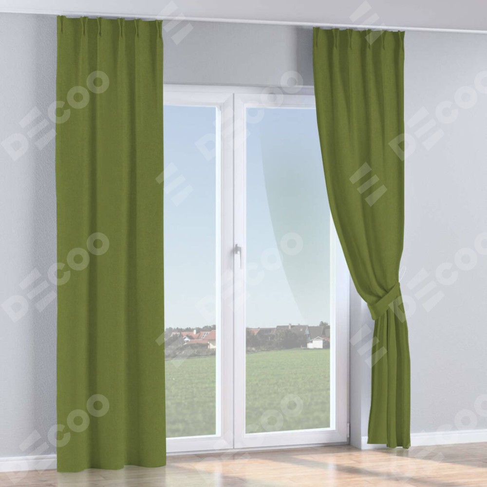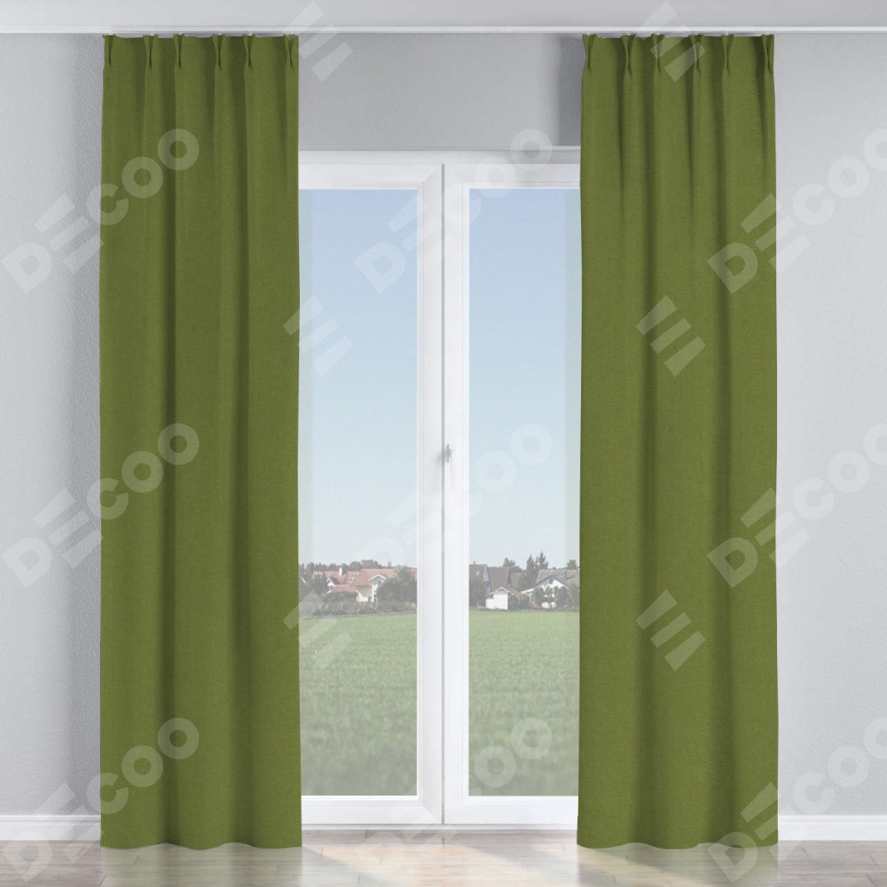 Комплект прямых штор, от производителя «Cortin», пошиты из ткани лён блэкаут оливковый, артикул ткани 69516. С изнаночной стороны в верхней части штор пристрачивается шторная лента с декоративными складками «Кустик». Для создания элегантных складок прямые шторы шьются по стандарту с коэффициентом 1:2 (на 100 см. ширины проёма 200 см. ширины ткани).