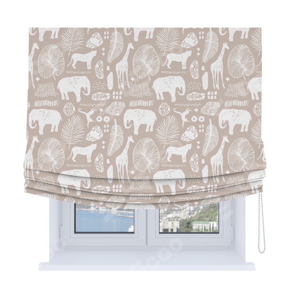 Римская штора Soft производителя «Cortin», используется для проёма, пошита из ткани блэкаут с нанесением сублимационной печати «Африканские животные». Имеет универсальный механизм и подходит для монтажа: на потолок, на стену и в нишу. В отличие от стандартных римских штор, римская штора Soft не имеет горизонтальных вставок и нижнего отвеса. Это позволяет ткани произвольно драпироваться в свободные мягкие складки.