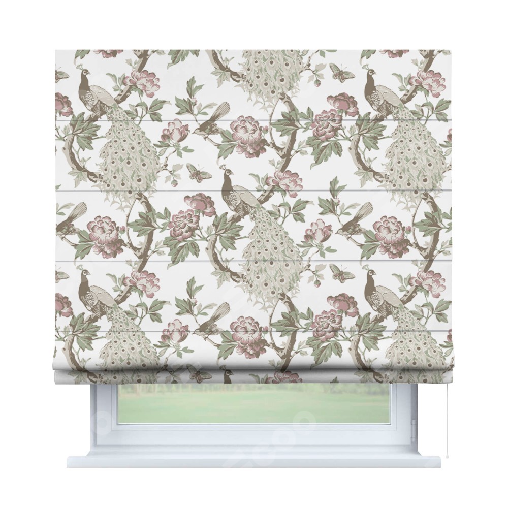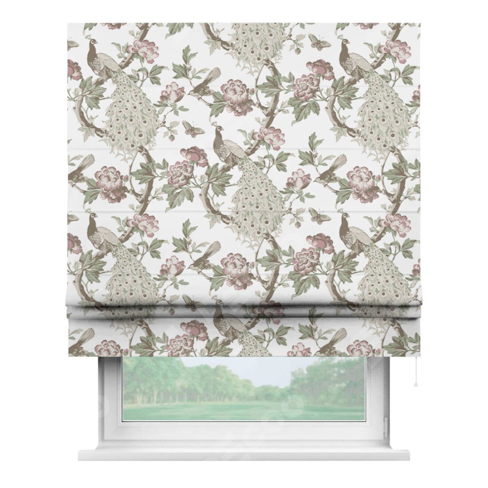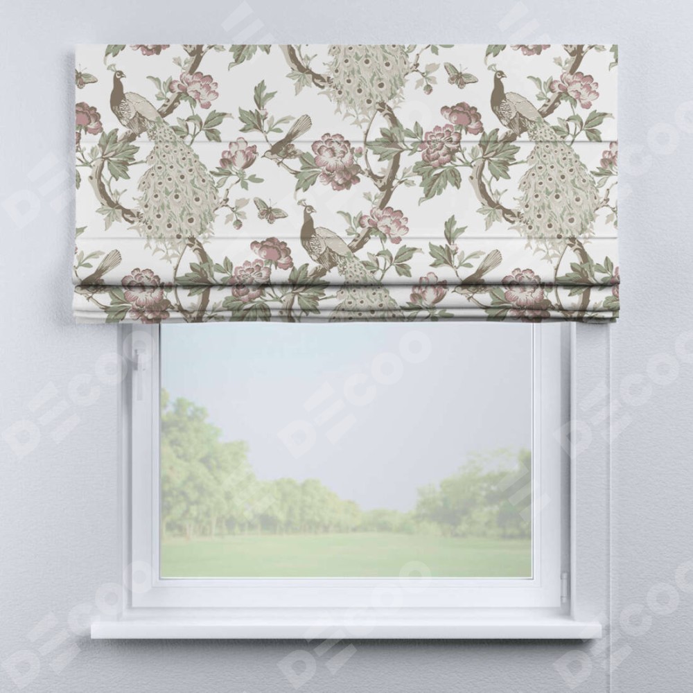 Римская штора «Кортин» для проема «Гордые павлины» отлично подойдёт для интерьера: в кухню, в спальню и на балкон.
