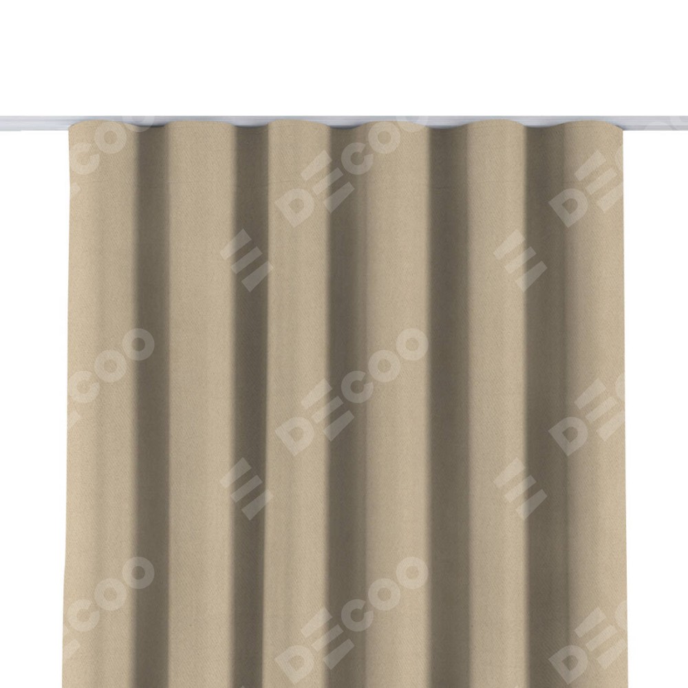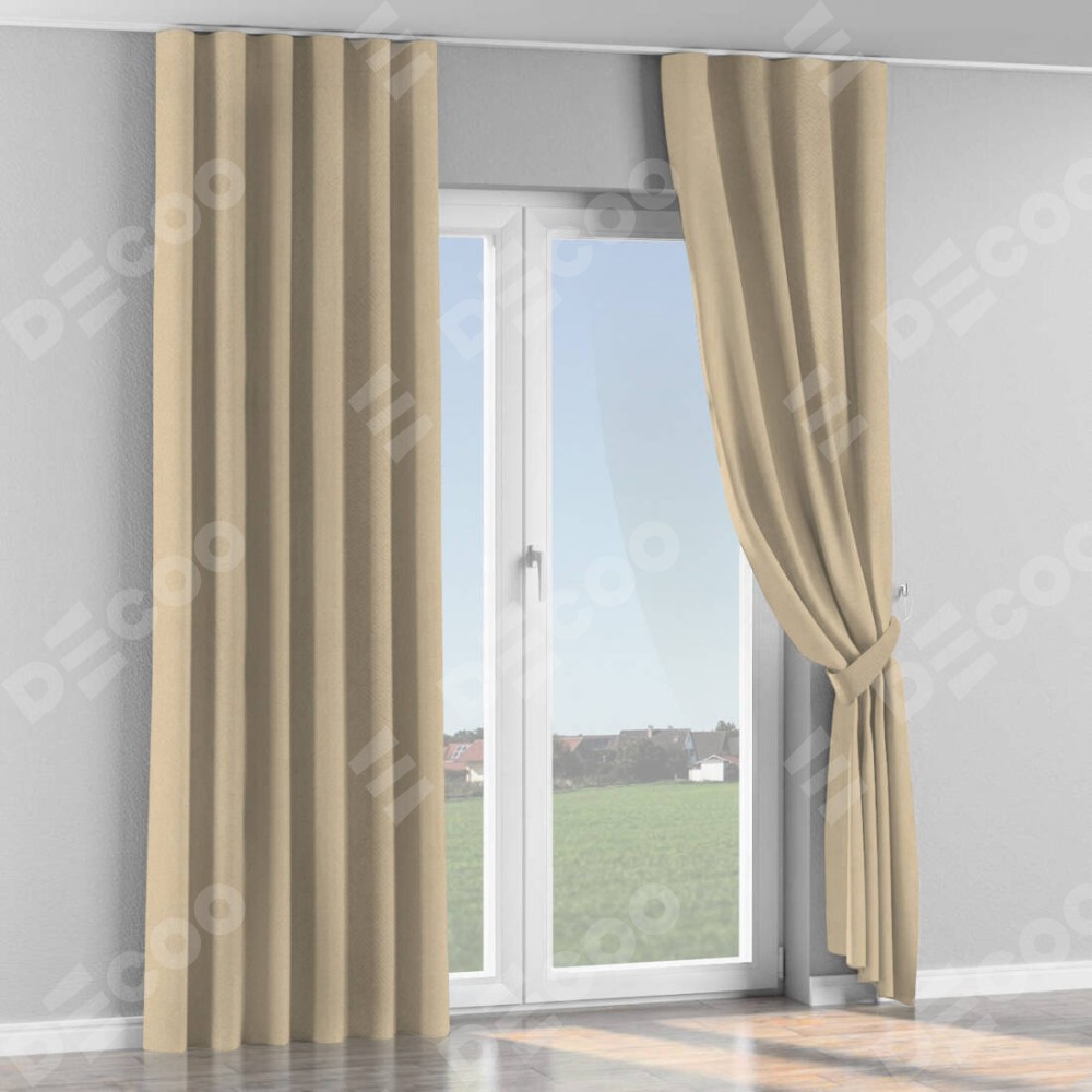 Комплект прямых штор, от производителя «Cortin», пошиты из ткани блэкаут однотонный кофейно-бежевый, артикул ткани 12095−1. С изнаночной стороны в верхней части штор пристрачивается шторная лента с декоративными складками «Волна». Для создания элегантных складок прямые шторы шьются по стандарту с коэффициентом 1:2 (на 100 см. ширины проёма 200 см. ширины ткани).