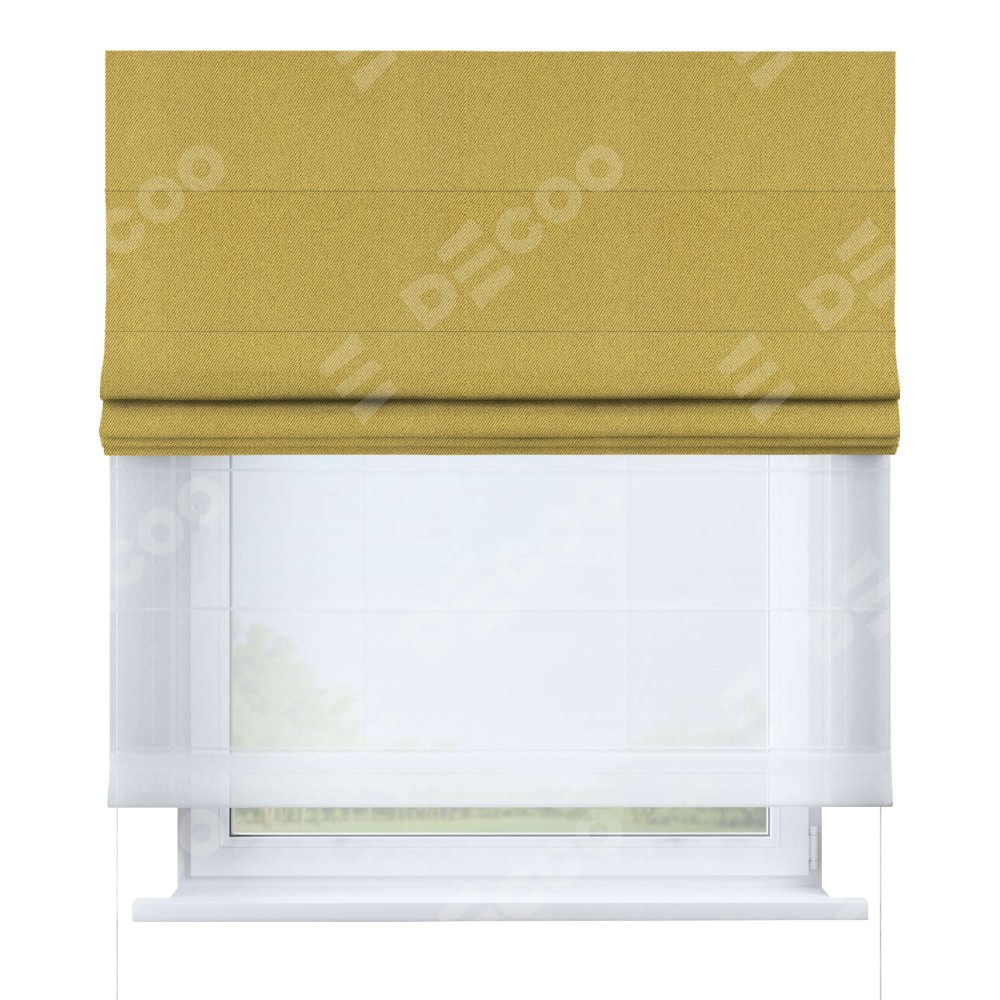 Римская штора день-ночь производителя «Cortin», используется для проёма, пошита из двух полотен, с лицевой стороны твид блэкаут пыльная горчица артикул 21588, вторая ткань тюль (по стандарту комплектуется тюль белого цвета артикул V-01). Имеет универсальный механизм и подходит для монтажа: на потолок, на стену и в нишу.