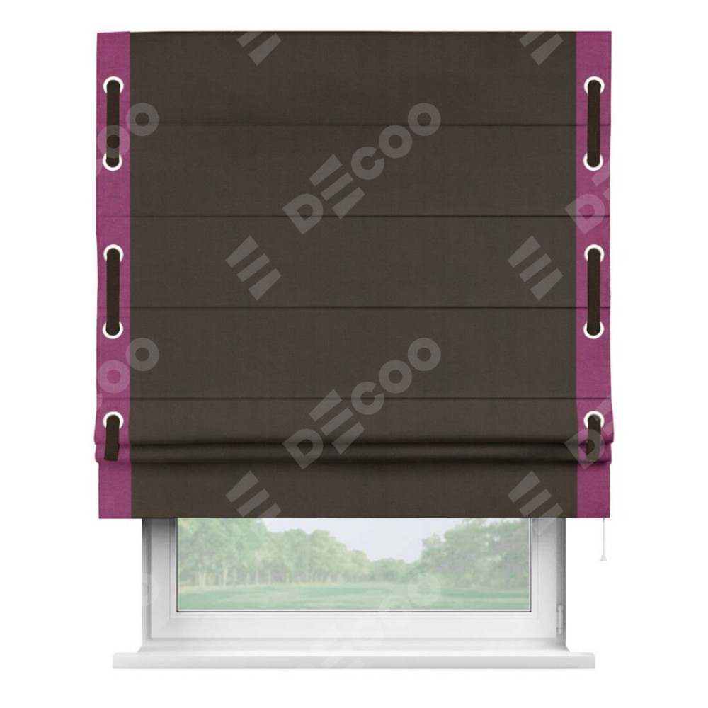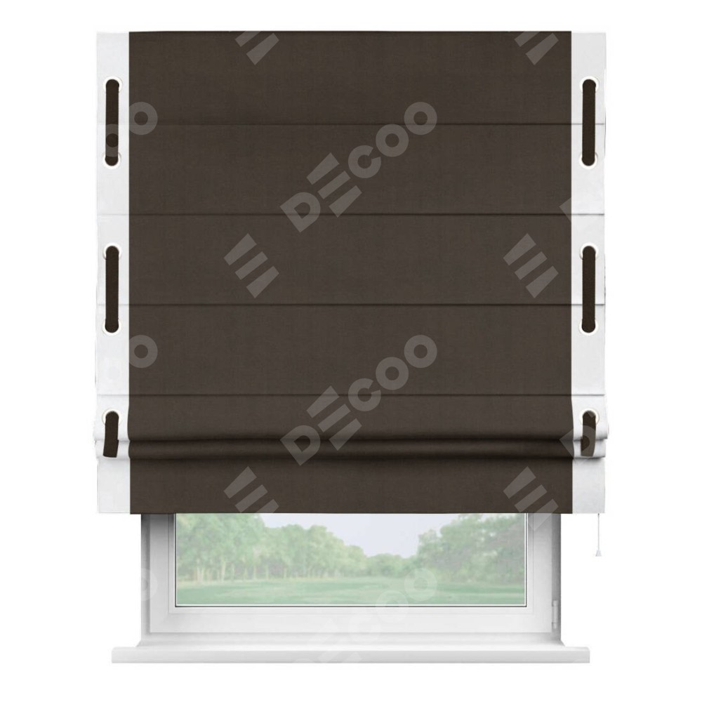 Римская штора производителя «Cortin», используется для проёма, пошита из ткани вельвет тёмно-коричневый, артикул ткани 30991. Отделка шторы кантом «Стрим Дуо» на кантах расположены люверсы с пояском, ткань для канта используется из вельвета разной расцветки на выбор. Ткань для пояска обычно используется из основной ткани шторы, а так же можно сделать из любой расцветки по желанию. Имеет универсальный механизм и подходит для монтажа: на потолок, на стену и в нишу.
