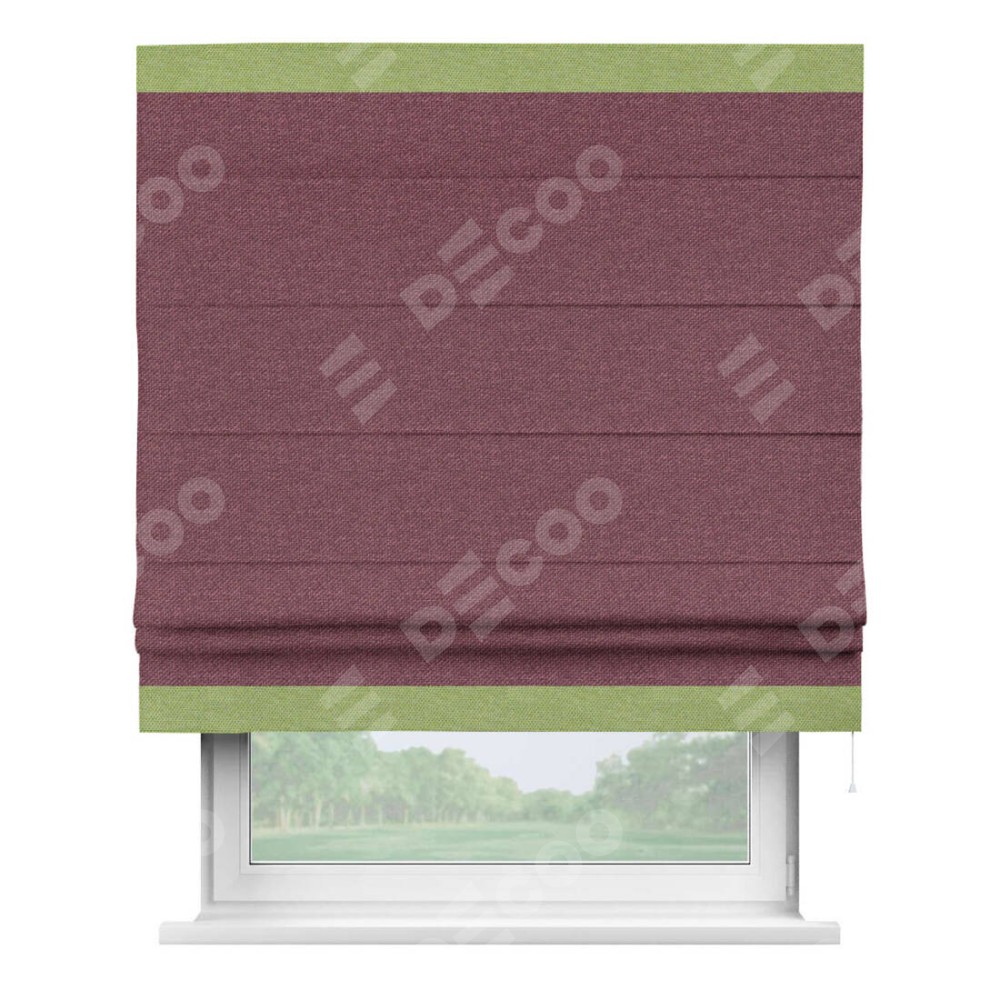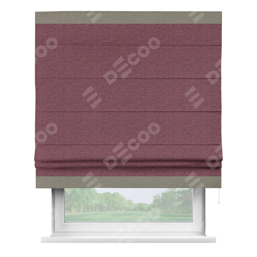 Римская штора производителя «Cortin», используется для проёма, пошита из ткани лён димаут марсала, артикул 1602. Отделка шторы кантом «Горизонт», ткань для канта используется из льна димаут разной расцветки на выбор. Имеет универсальный механизм и подходит для монтажа: на потолок, на стену и в нишу.