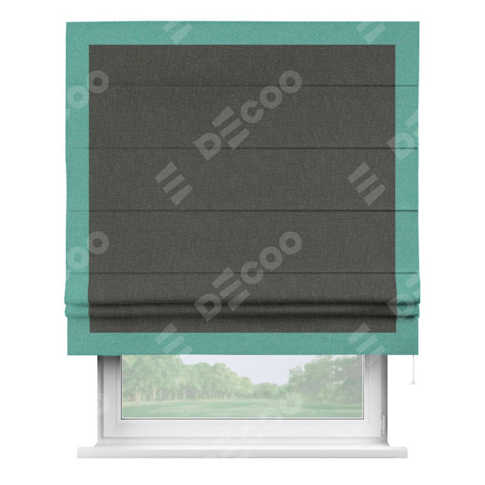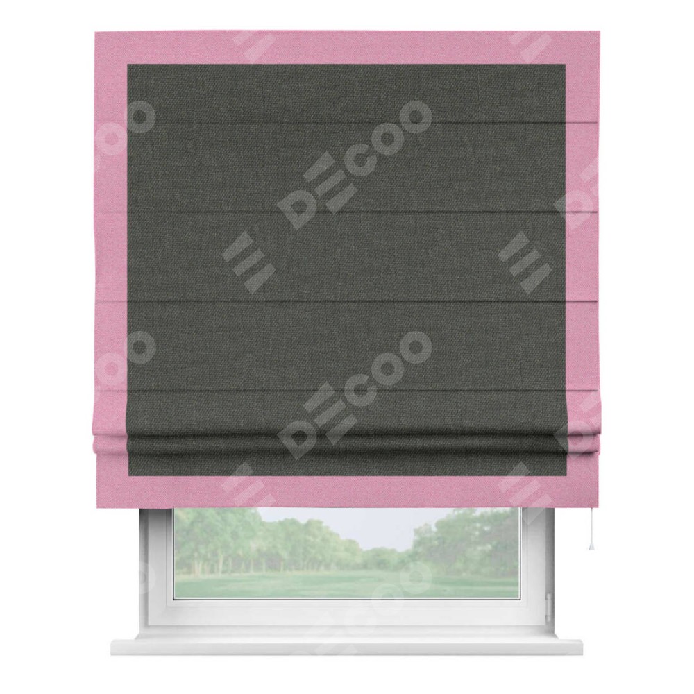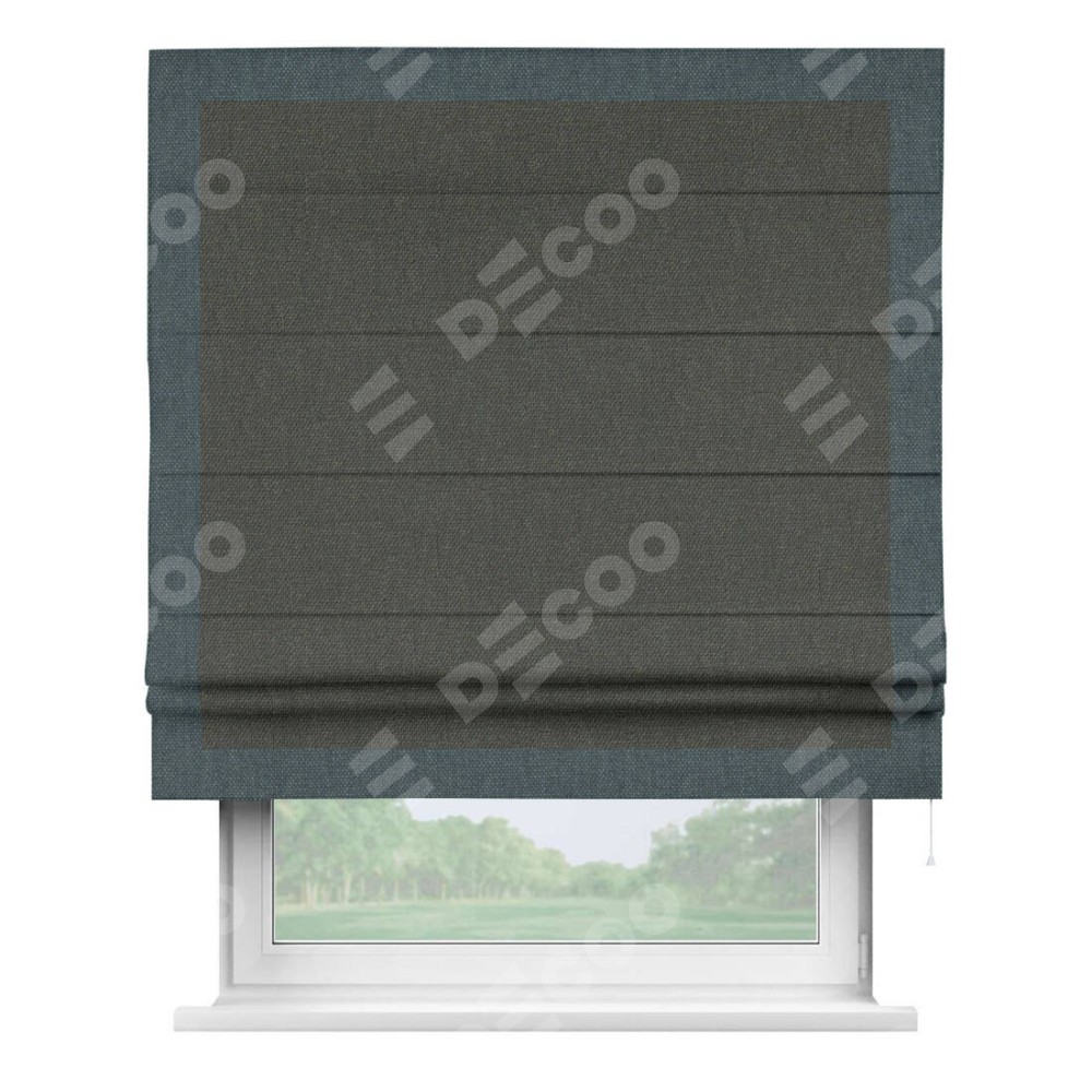 Римская штора производителя «Cortin», используется для проёма, пошита из ткани лён димаут графитово-серый, артикул 35129. Отделка шторы кантом «Чесс», ткань для канта используется из льна димаут разной расцветки на выбор. Имеет универсальный механизм и подходит для монтажа: на потолок, на стену и в нишу.