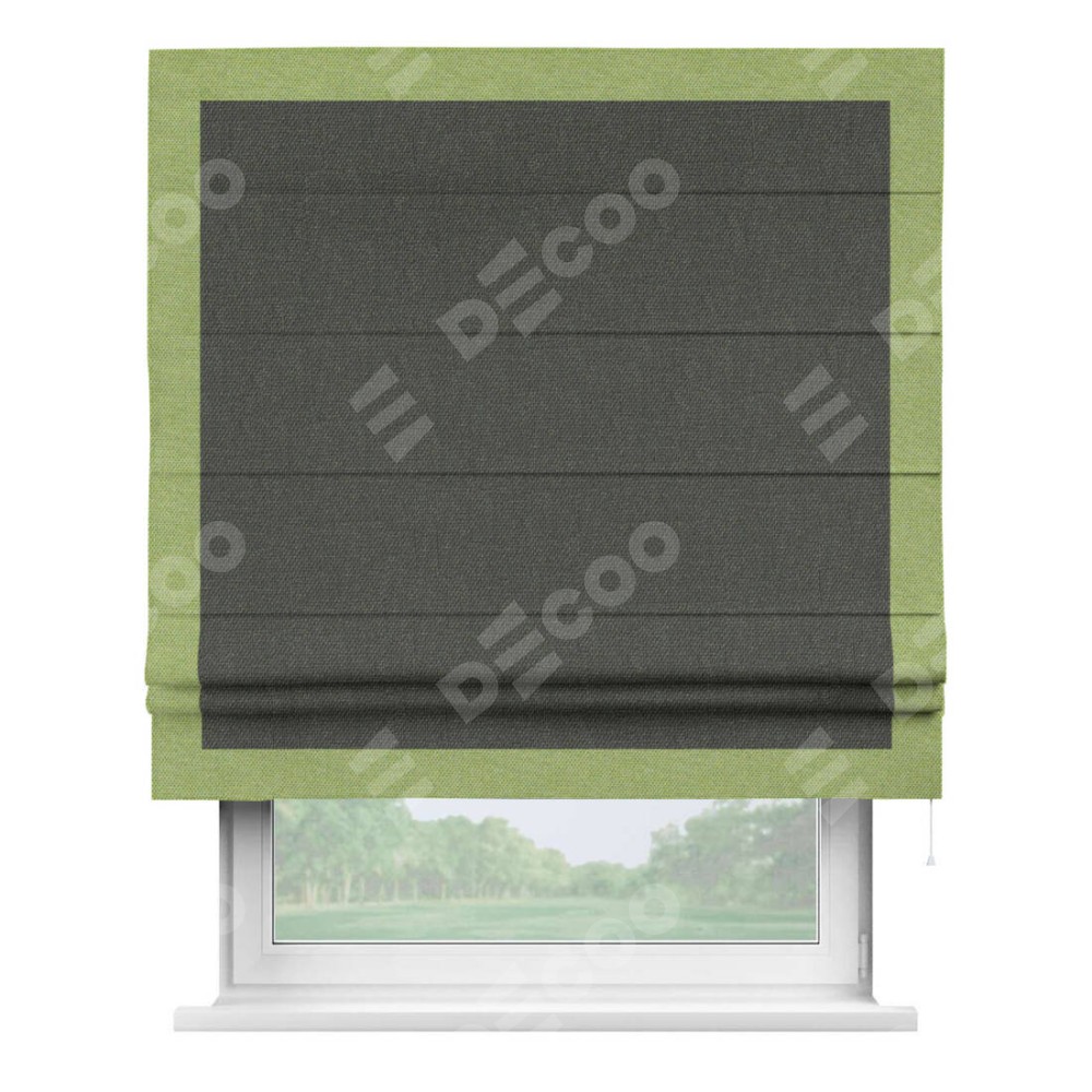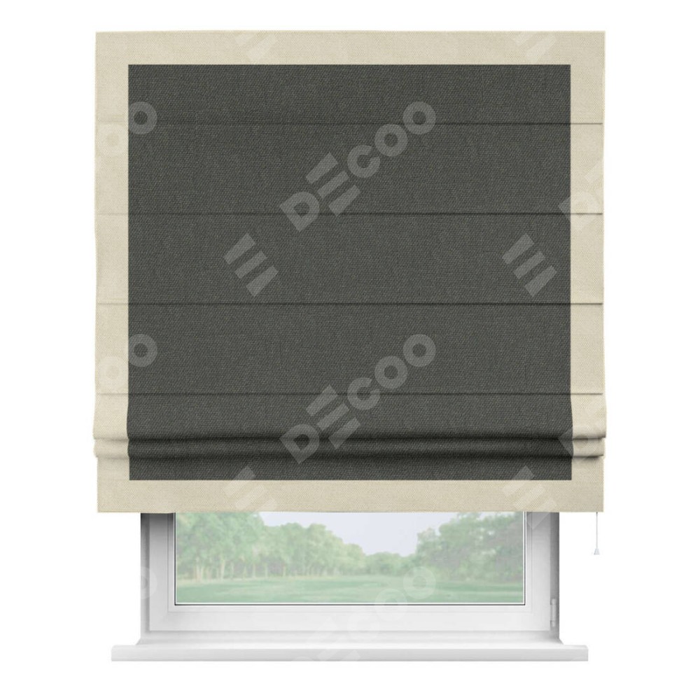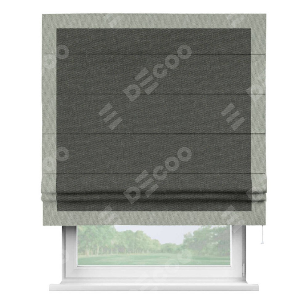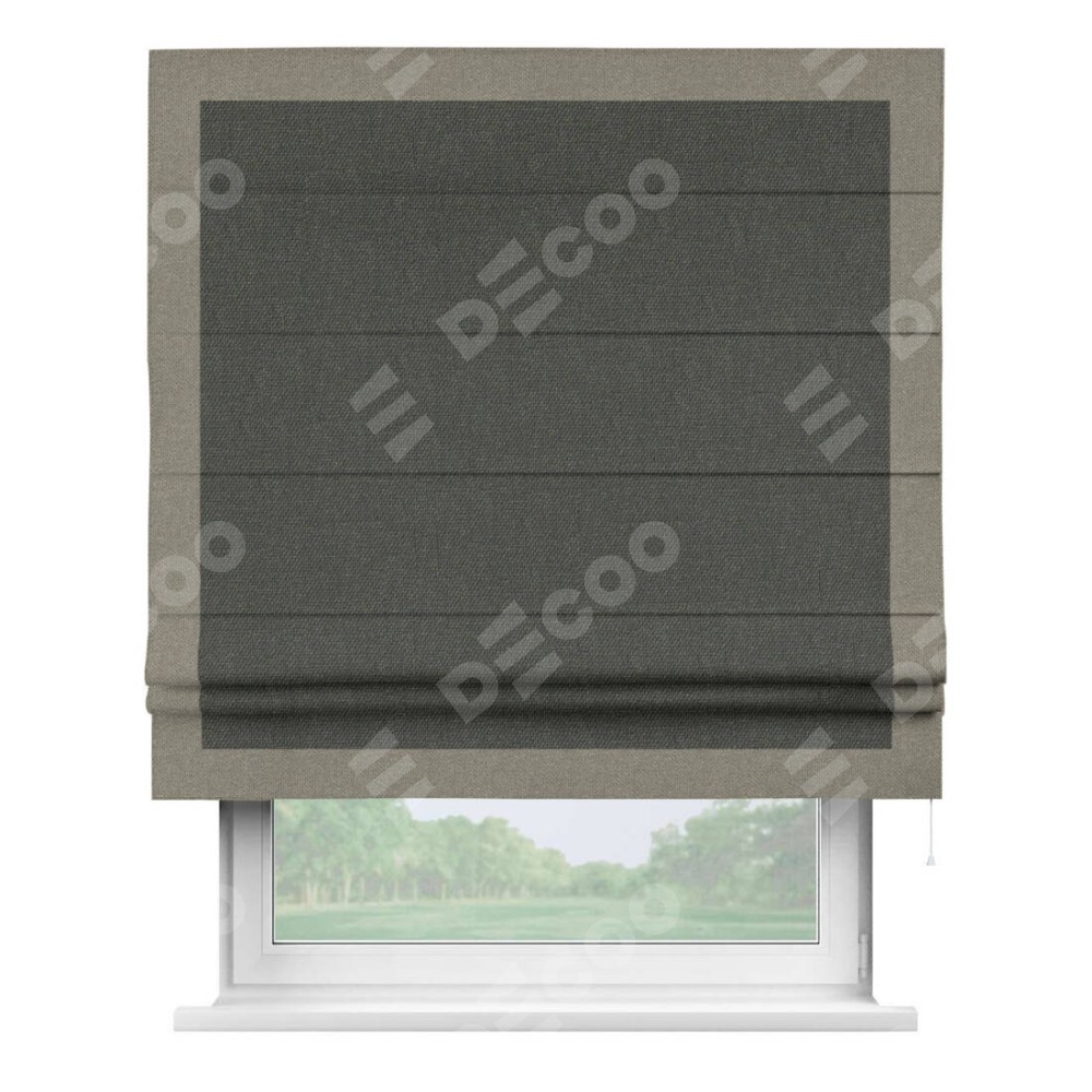 Римская штора производителя «Cortin», используется для проёма, пошита из ткани лён димаут графитово-серый, артикул 35129. Отделка шторы кантом «Чесс», ткань для канта используется из льна димаут разной расцветки на выбор. Имеет универсальный механизм и подходит для монтажа: на потолок, на стену и в нишу.