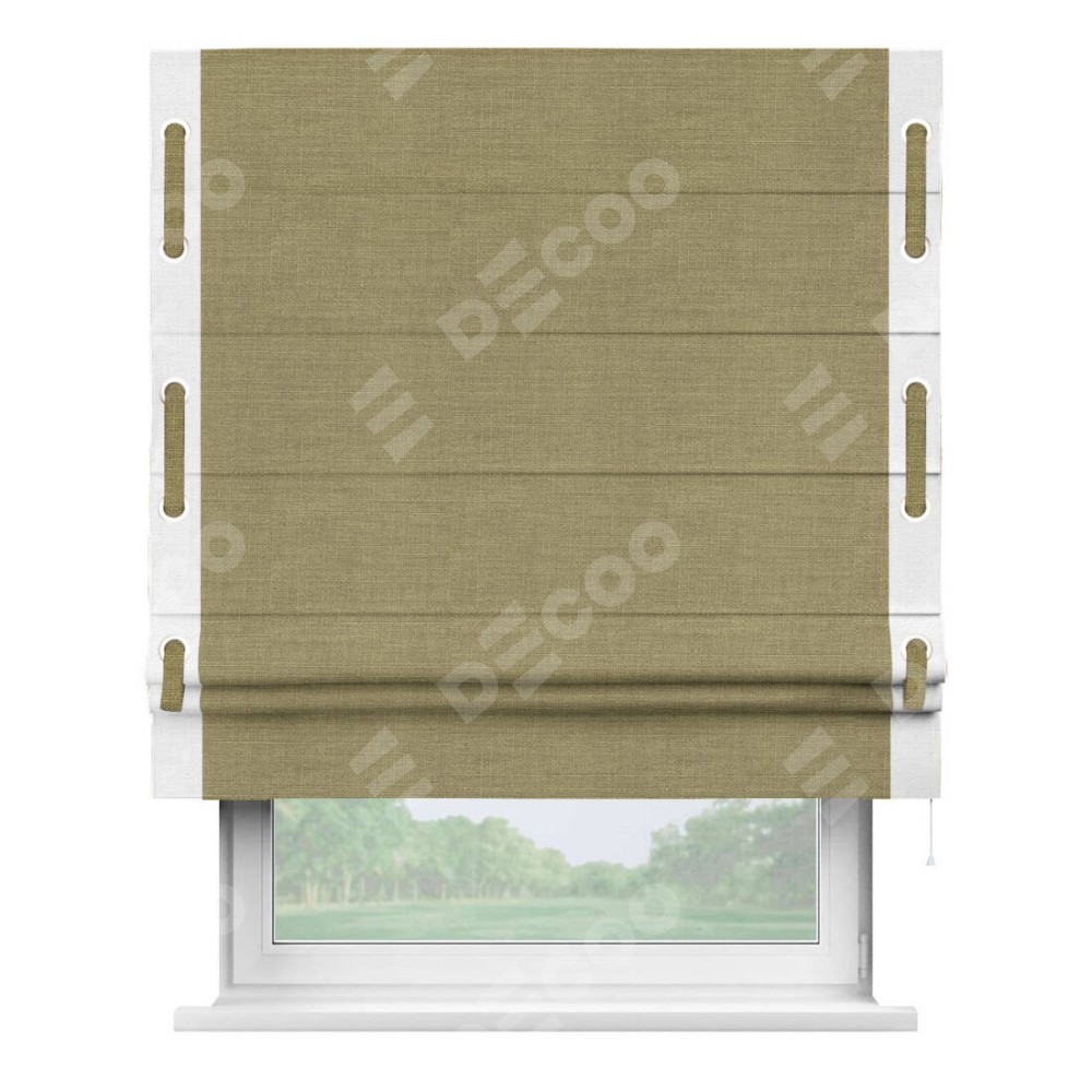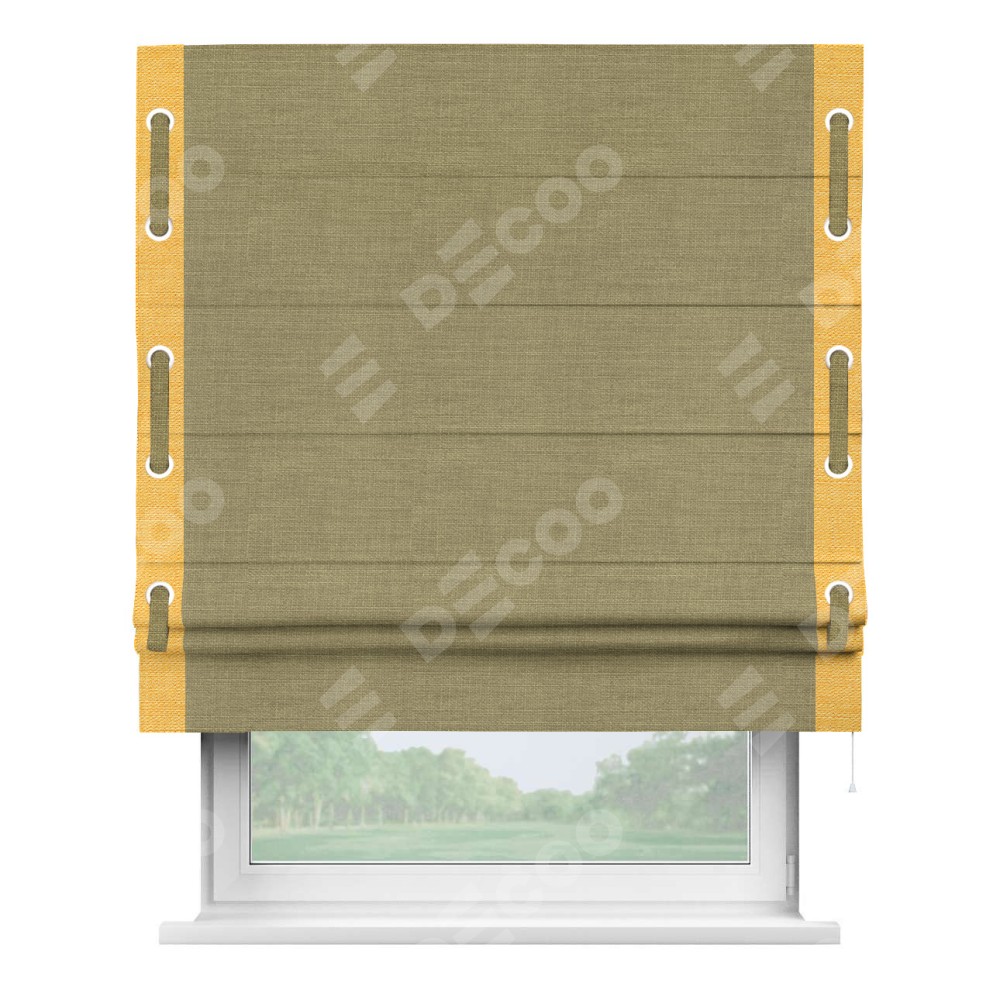 Римская штора производителя «Cortin», используется для проёма, пошита из ткани лён коричневый, артикул 7443. Отделка шторы кантом «Стрим Дуо» на кантах расположены люверсы с пояском, ткань для канта используется из льна разной расцветки на выбор. Ткань для пояска обычно используется из основной ткани шторы, а так же можно сделать из любой расцветки по желанию. Имеет универсальный механизм и подходит для монтажа: на потолок, на стену и в нишу.