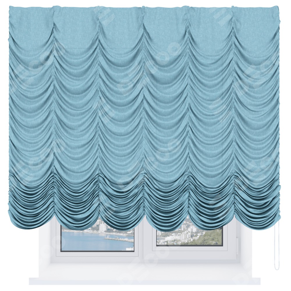 Французская штора производителя «Cortin», используется для проёма, пошита из ткани лён кашемир голубой, артикул ткани 21616. Имеет универсальный механизм и подходит для монтажа: на потолок и на стену.