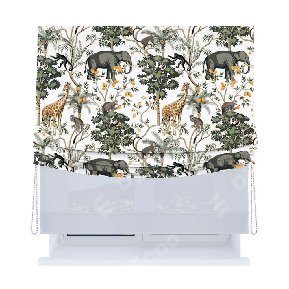 Римская штора день-ночь производителя «Cortin», используется для проёма, пошита из двух полотен, с лицевой блэкаут с нанесением сублимационной печати «Африканские равнины», вторая ткань тюль (по стандарту комплектуется тюль белого цвета артикул V-01). Имеет универсальный механизм и подходит для монтажа: на потолок, на стену и в нишу. Удобное управление каждой шторой отдельно.