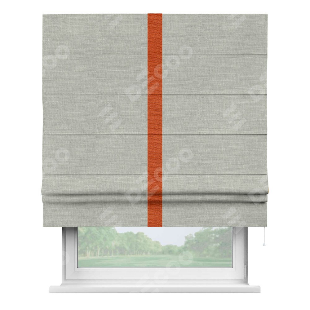 Римская штора производителя «Cortin», используется для проёма, пошита из ткани лён серый, артикул 7440. Отделка шторы кантом «Хайвэй», ткань для канта используется из льна разной расцветки на выбор. Имеет универсальный механизм и подходит для монтажа: на потолок, на стену и в нишу.