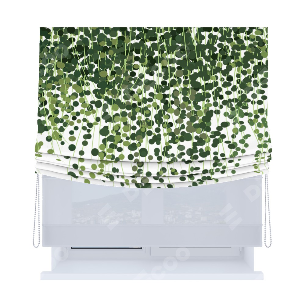 Римская штора день-ночь производителя «Cortin», используется для проёма, пошита из двух полотен, с лицевой блэкаут с нанесением сублимационной печати «Зелёный занавес», вторая ткань тюль (по стандарту комплектуется тюль белого цвета артикул V-01). Имеет универсальный механизм и подходит для монтажа: на потолок, на стену и в нишу. Удобное управление каждой шторой отдельно.