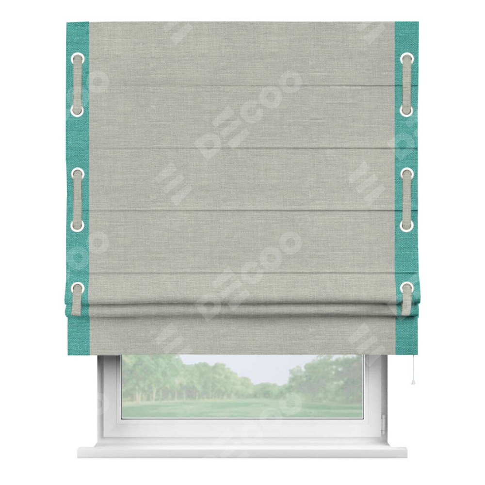 Римская штора производителя «Cortin», используется для проёма, пошита из ткани лён серый, артикул 7440. Отделка шторы кантом «Стрим Дуо» на кантах расположены люверсы с пояском, ткань для канта используется из льна разной расцветки на выбор. Ткань для пояска обычно используется из основной ткани шторы, а так же можно сделать из любой расцветки по желанию. Имеет универсальный механизм и подходит для монтажа: на потолок, на стену и в нишу.