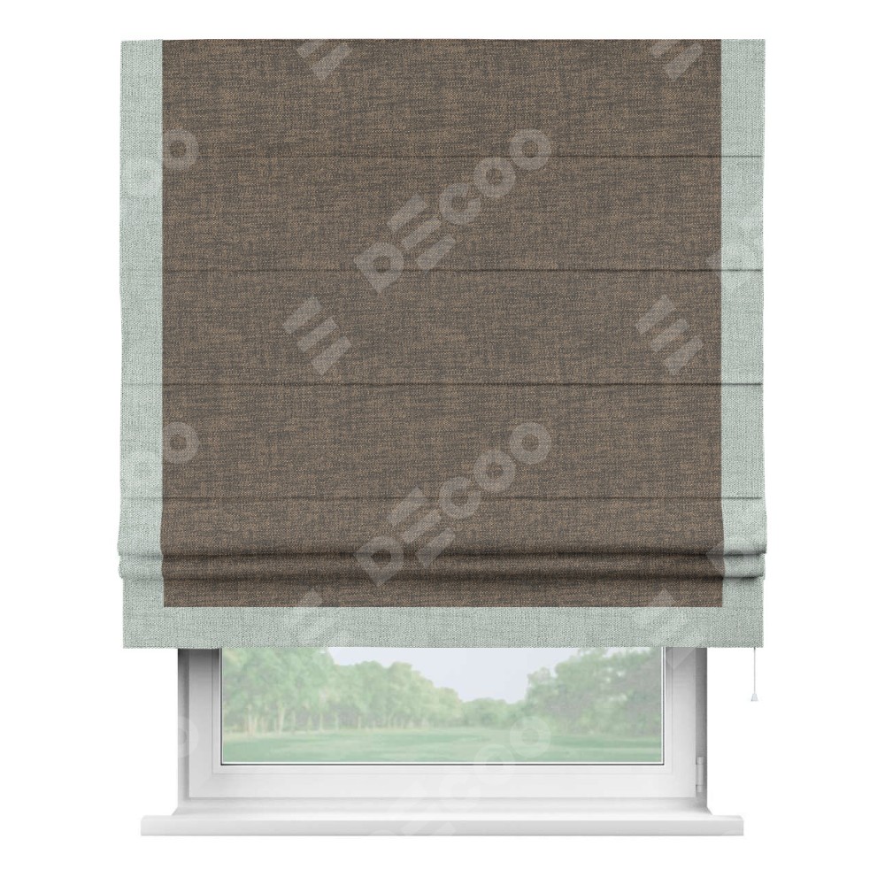 Римская штора производителя «Cortin», используется для проёма, пошита из ткани рогожка димаут коричневый, артикул 80420. Отделка шторы кантом «Виктория», ткань для канта используется из рогожки димаут разной расцветки на выбор. Имеет универсальный механизм и подходит для монтажа: на потолок, на стену и в нишу.