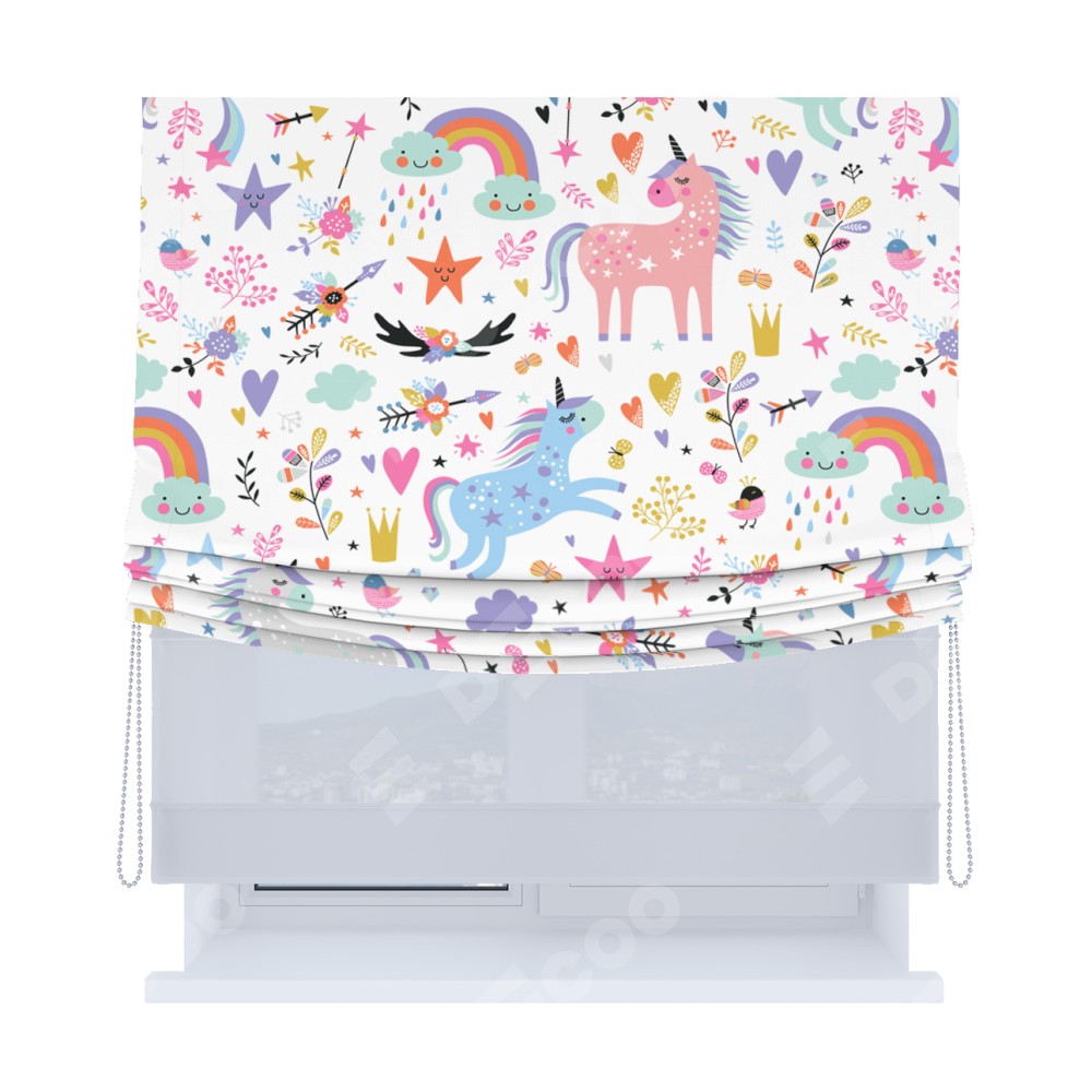 Римская штора день-ночь производителя «Cortin», используется для проёма, пошита из двух полотен, с лицевой блэкаут с нанесением сублимационной печати «Радужные единороги», вторая ткань тюль (по стандарту комплектуется тюль белого цвета артикул V-01). Имеет универсальный механизм и подходит для монтажа: на потолок, на стену и в нишу. Удобное управление каждой шторой отдельно.